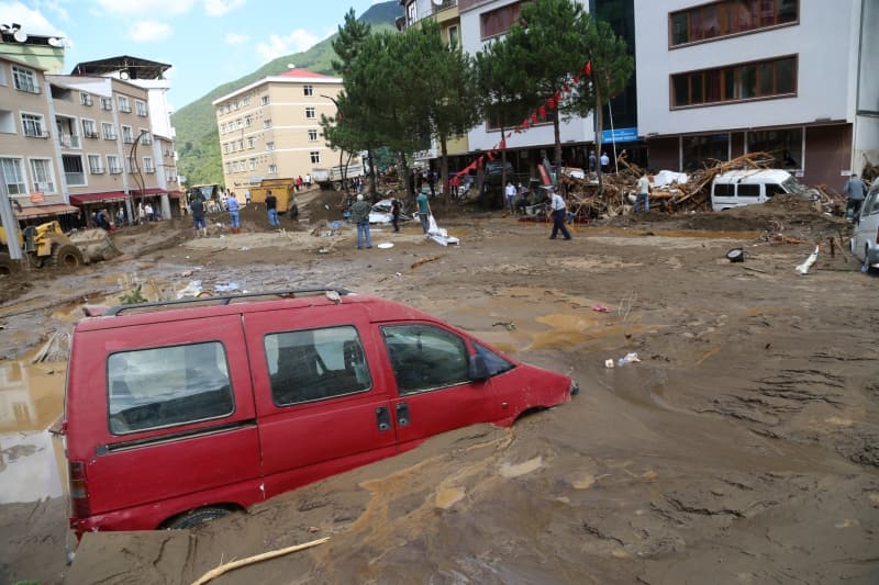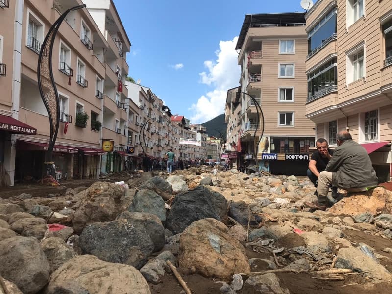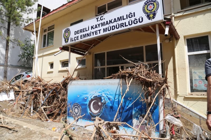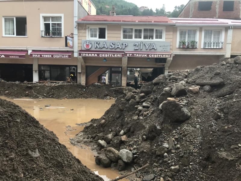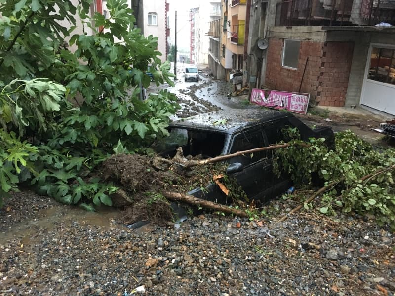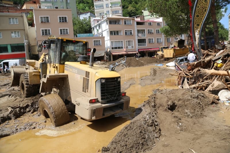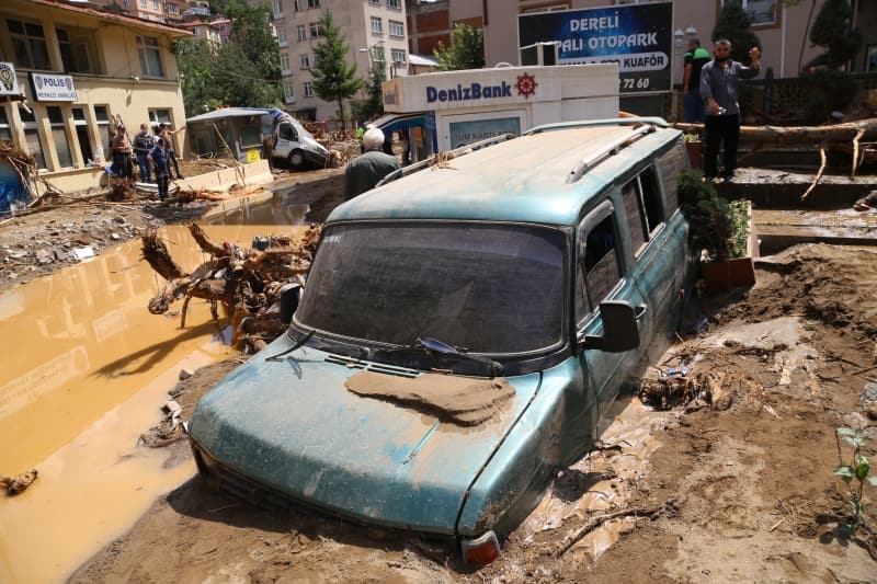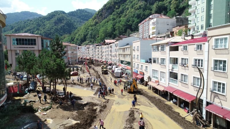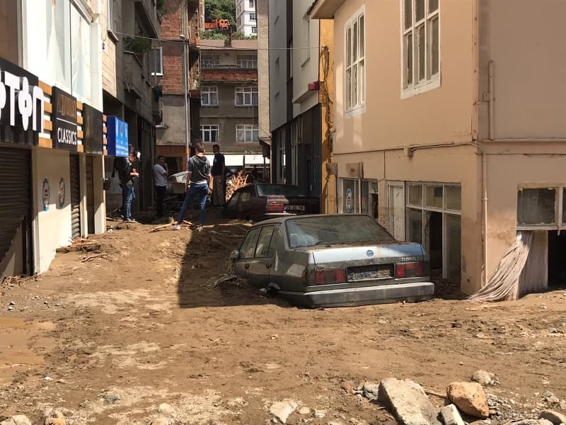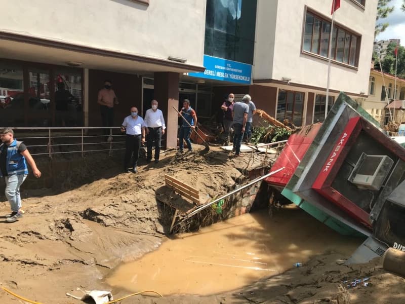Öte yandan balçık, taş ve ağaç parçalarıyla dolan Dereli ilçesinde afetin boyutu, havadan görüntülendi. İlçe merkezinde yer yer 3 metreye ulaşan balçık nedeniyle iş yerleri ve dükkanlar ağır hasar gördü, sürüklenen araçlar ise toprağa saplandı.