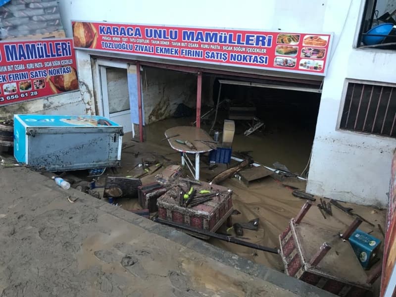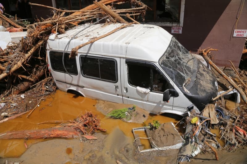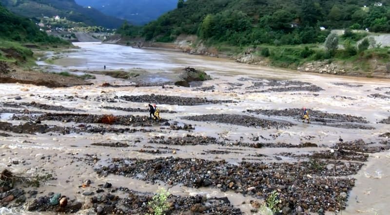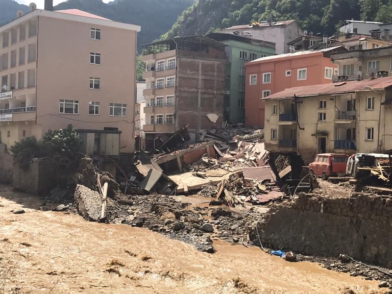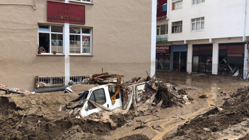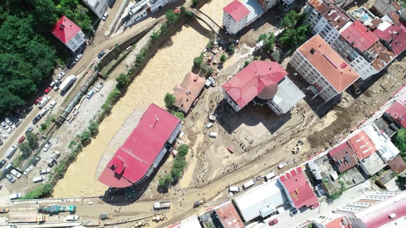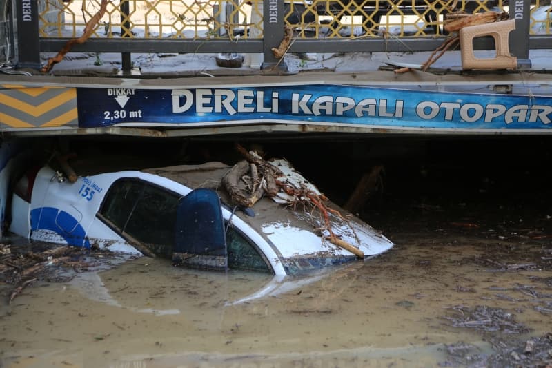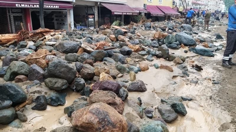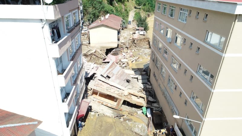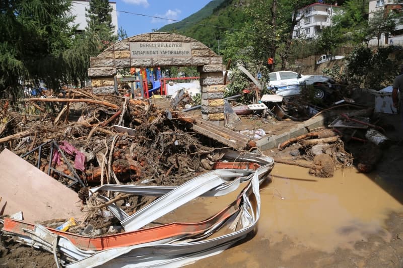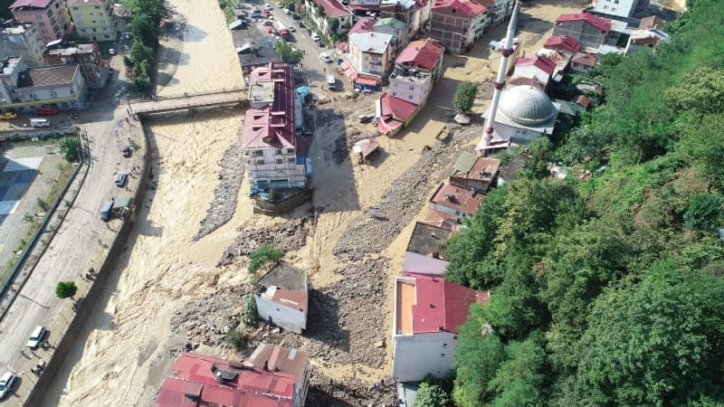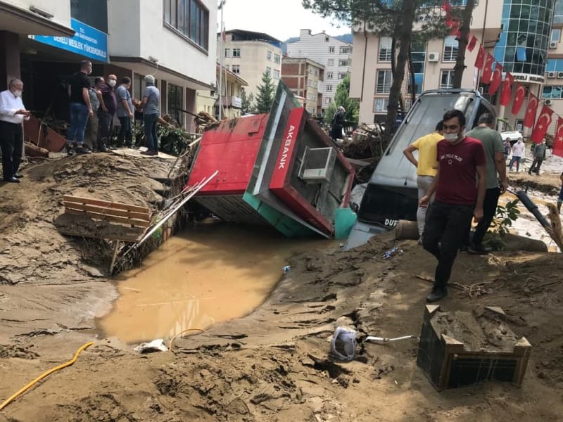 Öte yandan balçık, taş ve ağaç parçalarıyla dolan Dereli ilçesinde afetin boyutu, havadan görüntülendi. İlçe merkezinde yer yer 3 metreye ulaşan balçık nedeniyle iş yerleri ve dükkanlar ağır hasar gördü, sürüklenen araçlar ise toprağa saplandı.