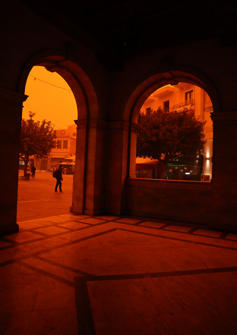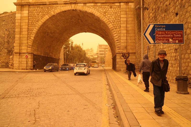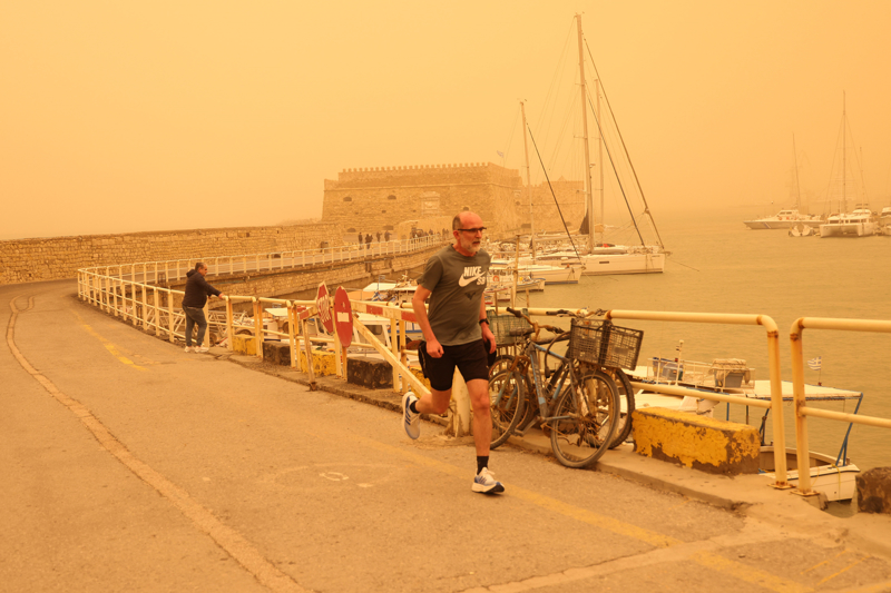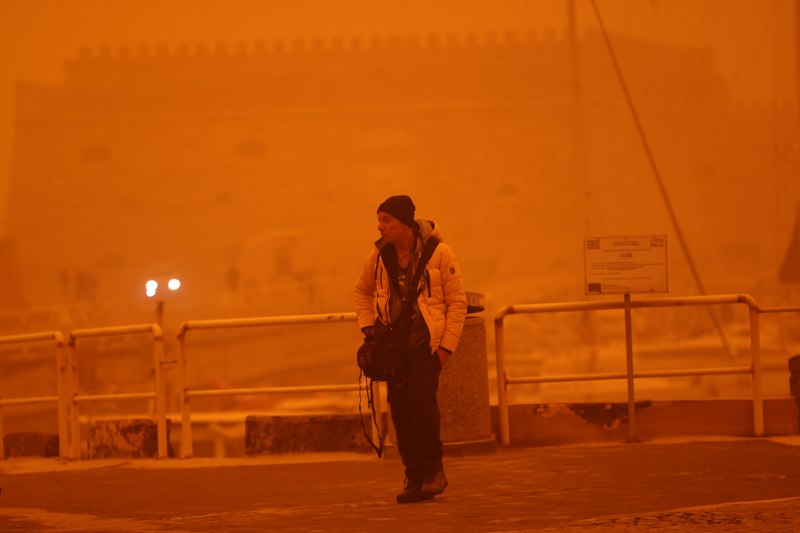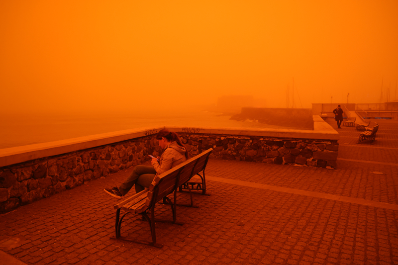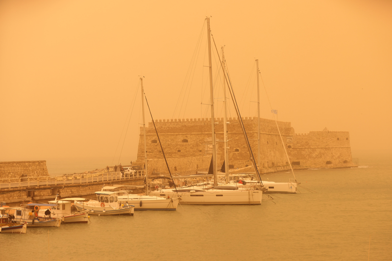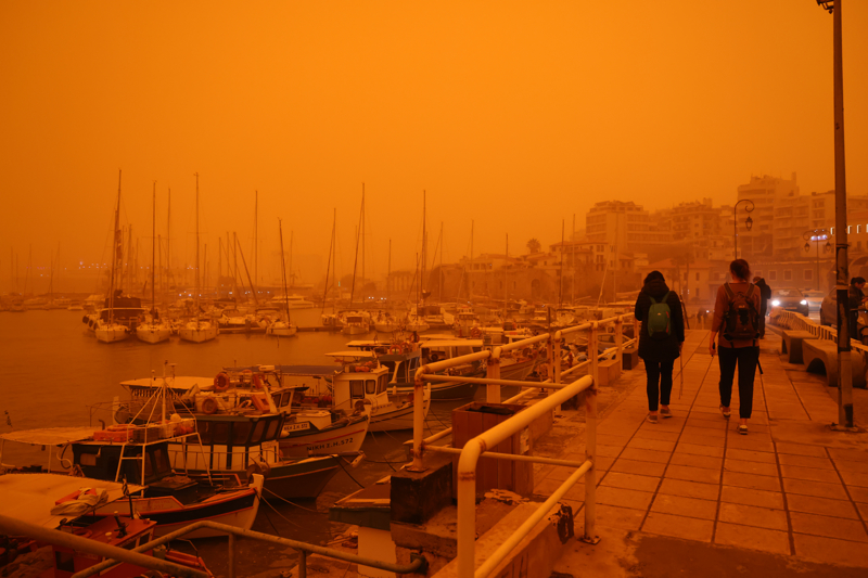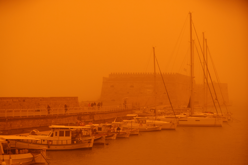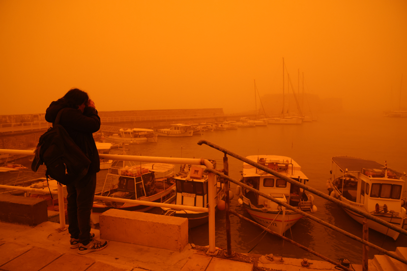 Yunanistan genelindeki kötü hava koşulları devam ederken, Girit Adası'nda gökyüzü Afrika'dan gelen çöl tozu nedeniyle kırmızıya büründü.