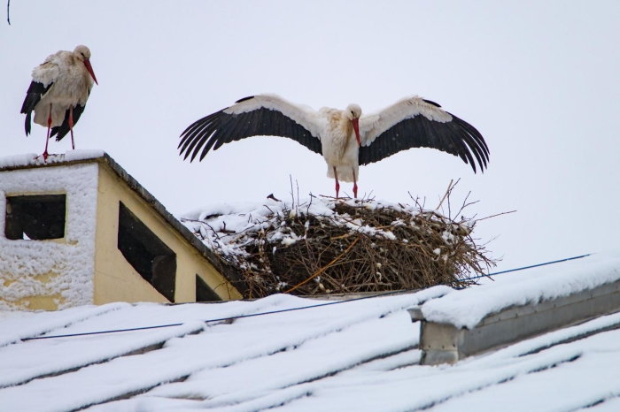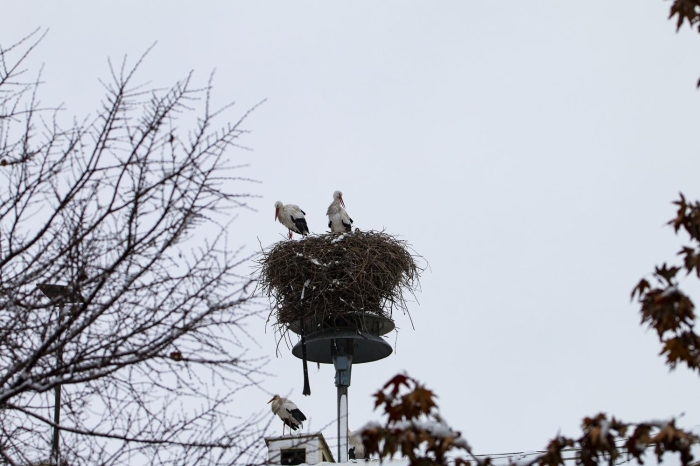 Ansızın bastıran kar yağışı nedeniyle yuvalarından ayrılamayan leylekler, yağışın dinmesini bekledi.