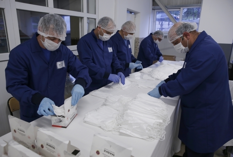 Tek kullanımlık maskelerin üretimi için 3 vardiya halinde 40'ar personelin gece-gündüz çalıştığı atölyede, 50'şer paket halinde hazırlanan maskeler kolluk güçleri, AFAD, Vefa Sosyal Destek Grubu'nun hizmetine sunuluyor.