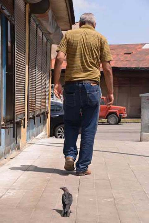 Gün boyu kendisini kurtaran Özpolat'ın yanından ayrılmayan yavru karga, bazen Özpolat'ın peşinden yürüyerek kahveye gidiyor.