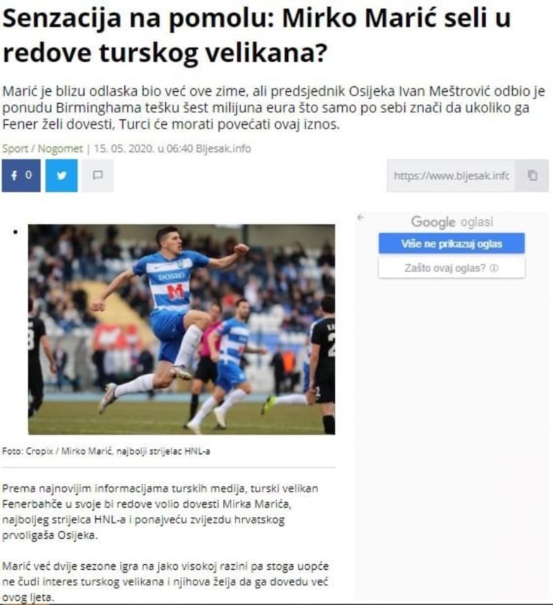 Bljesak'ta yer alan haberde, forvet arayışlarını sürdüren sarı-lacivertlilerin Mirko Maric'i renklerine katacağı ileri sürüldü.