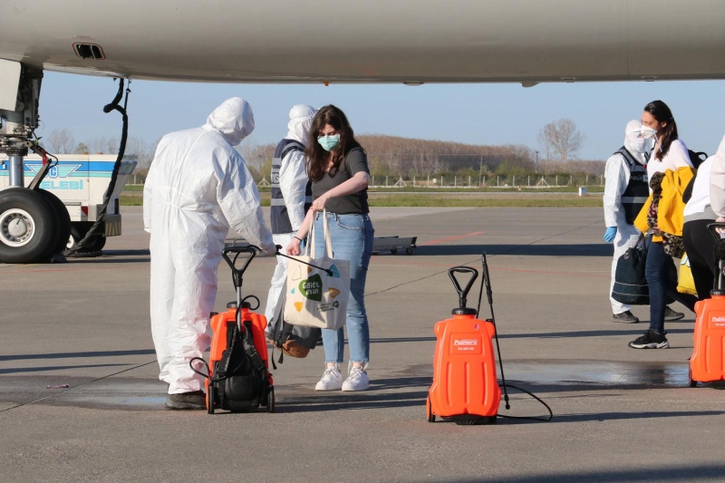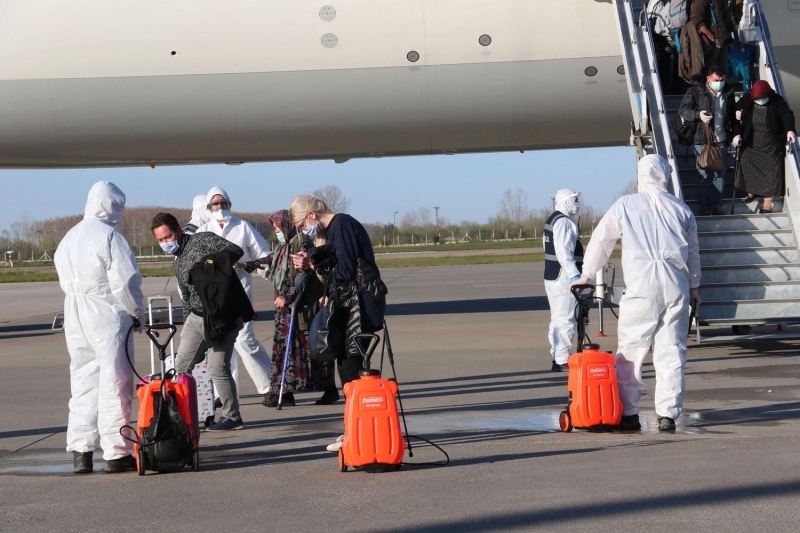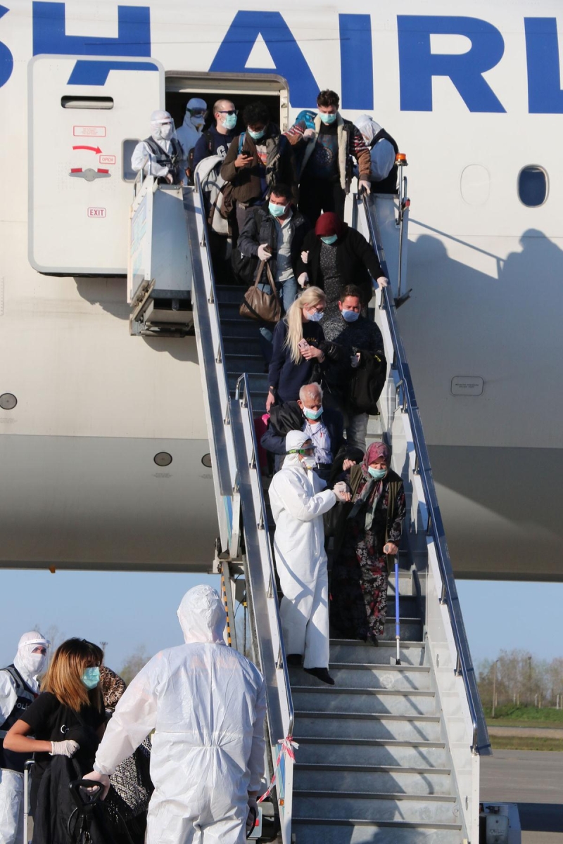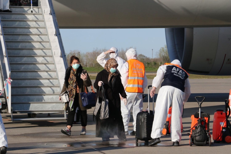 Özel kıyafetli sağlık görevlileri uçağa girerek, yolcuların ateşlerini ölçtü yaptı.