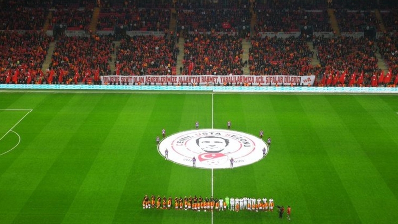 Galatasaray'ın Süper Lig'in 24. haftasında Gençlerbirliği'ni konuk ettiği maçta İdlib şehitleri anıldı. Maç öncesinde şehitlerimizin isimleri anons edilirken Galatasaray tribünlerinden bu anonslara 'Burada' sözüyle karşılık geldi.