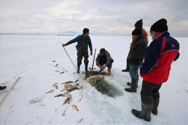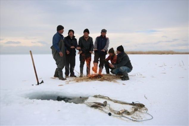 Balıkçılar, buz tabakasını baltayla kırıp göl donmadan önce serdikleri ağlarla balık avladı.