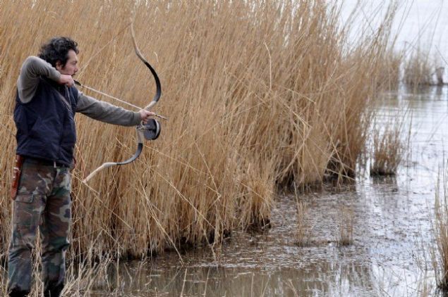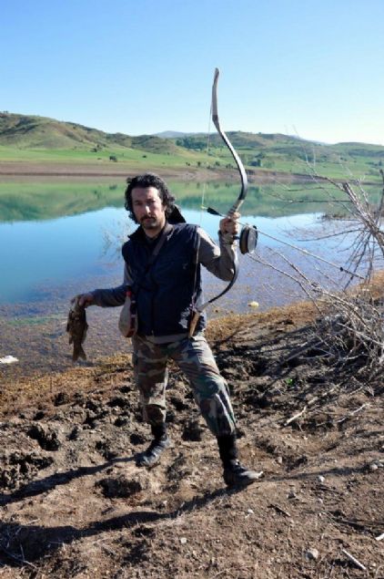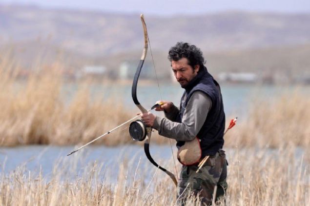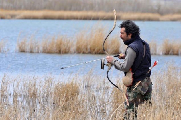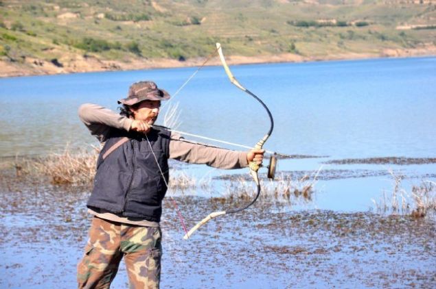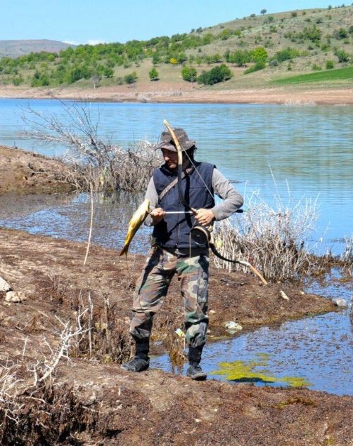 Sivas Göktürk Okçuluk Derneği Başkanı Beysun, geleneksel Türk yayı kullanarak, yöredeki göl ve nehirlerde okla balık avlıyor.