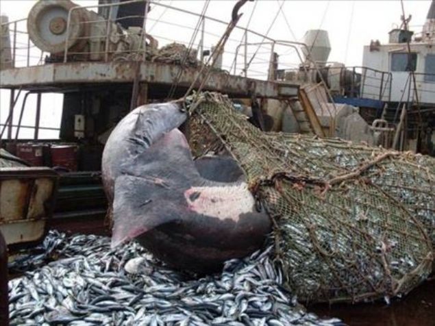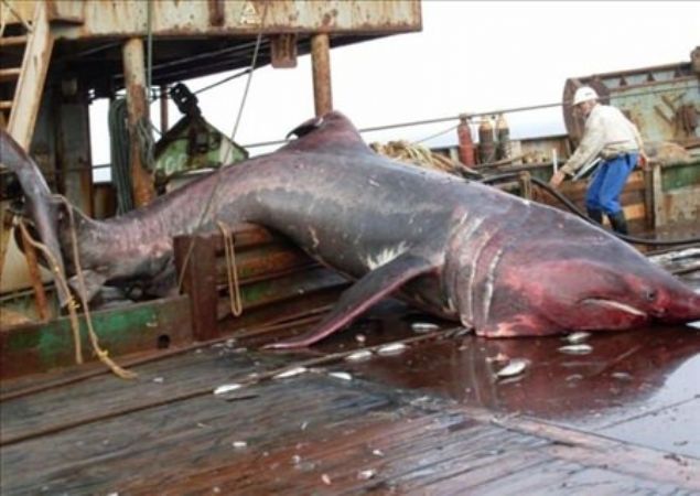 Güçlükle tekneye alınan ağları boşaltan balıkçıların önüne dev bir köpekbalığı çıktı.