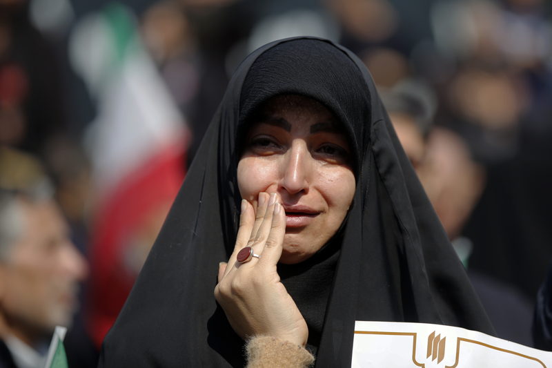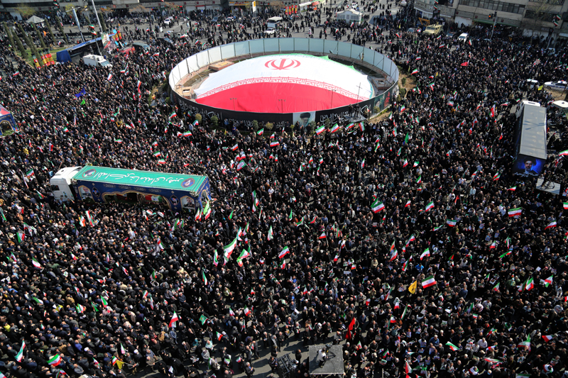 Tahran'daki İnkılap Meydanı'nda Laricani, Süleymani ve 84 asker için düzenlenen cenaze törenine binlerce İranlı katıldı.
