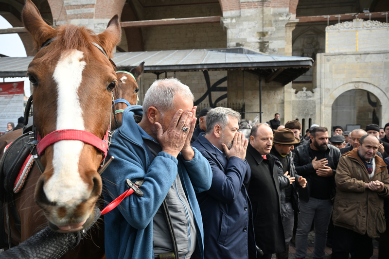 Buradan kendilerini karşılayan diğer atlılarla yoluna devam eden hacı adayları Saraçlar Caddesi'nden geçerek Eski Cami önüne ulaştı.