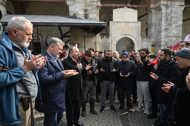Cuma namazını Eski Cami'de kılan grup cami çıkışı vatandaşlarla bir araya geldi.