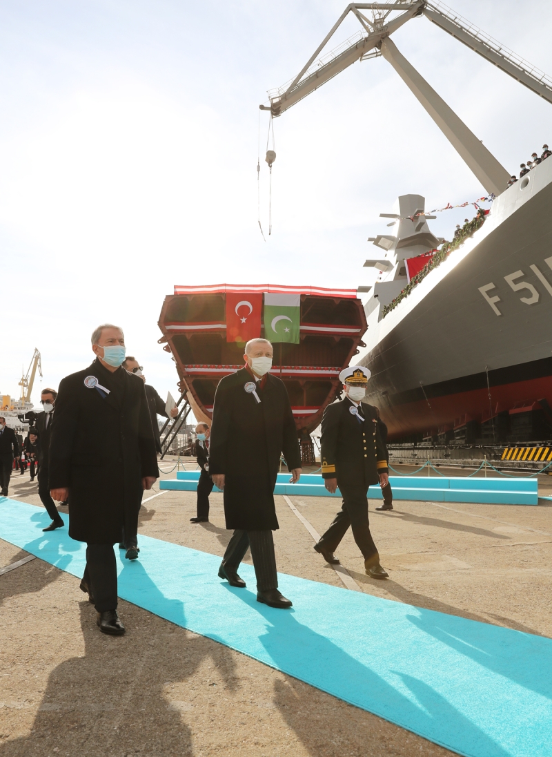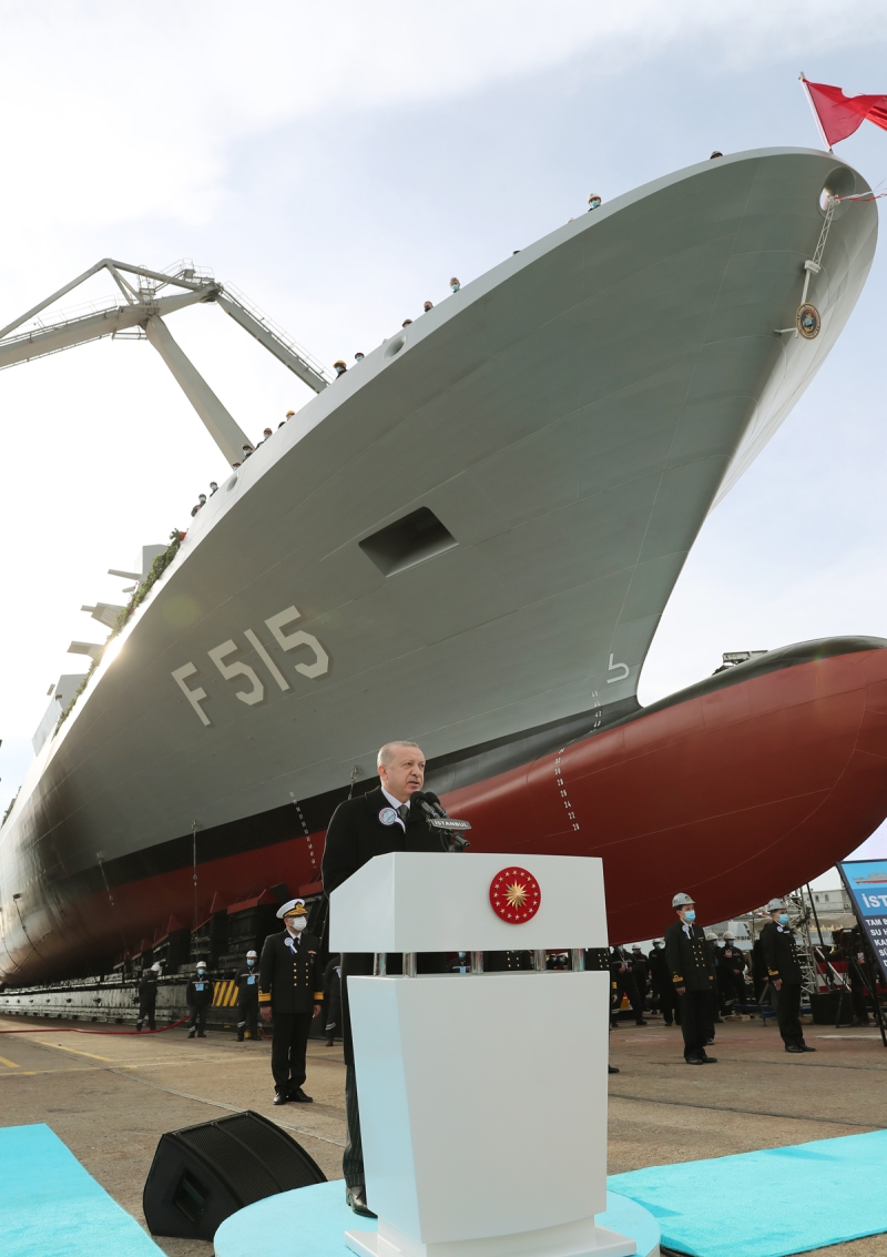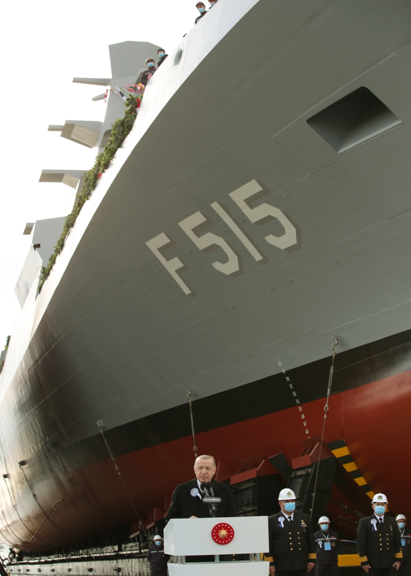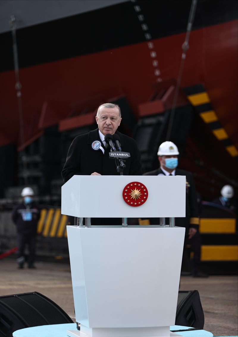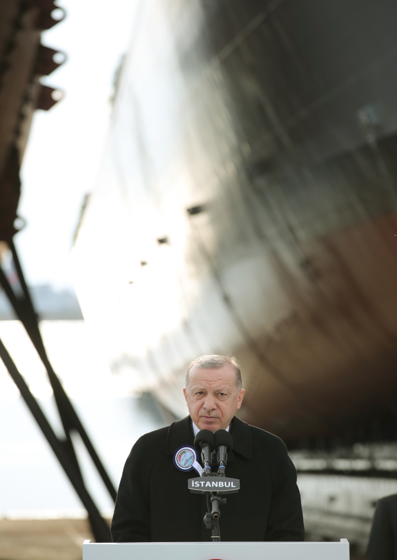 İstanbul Fırkateyni'nin denize indirilme töreninde konuşan Başkan Erdoğan, 'Kendi savaş gemisini tasarlayan, inşa eden ve idamesini gerçekleştirebilen 10 ülke içinde yer alıyoruz. İnsansız hava aracı üretiminde ise ilk üçteyiz.' dedi.