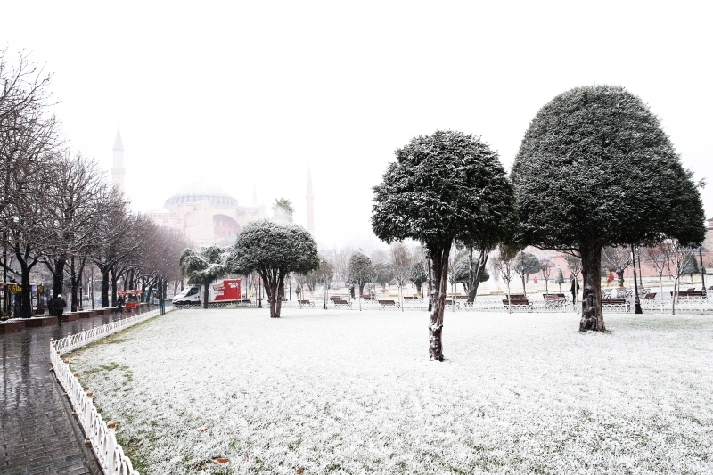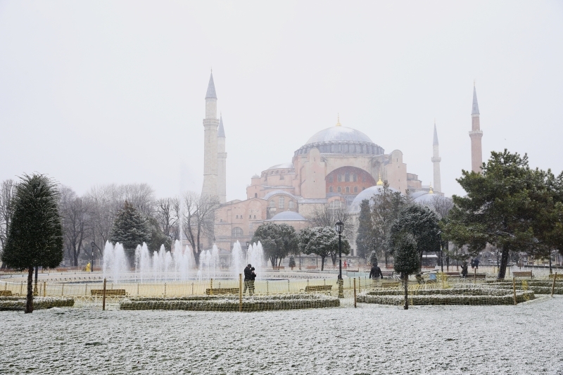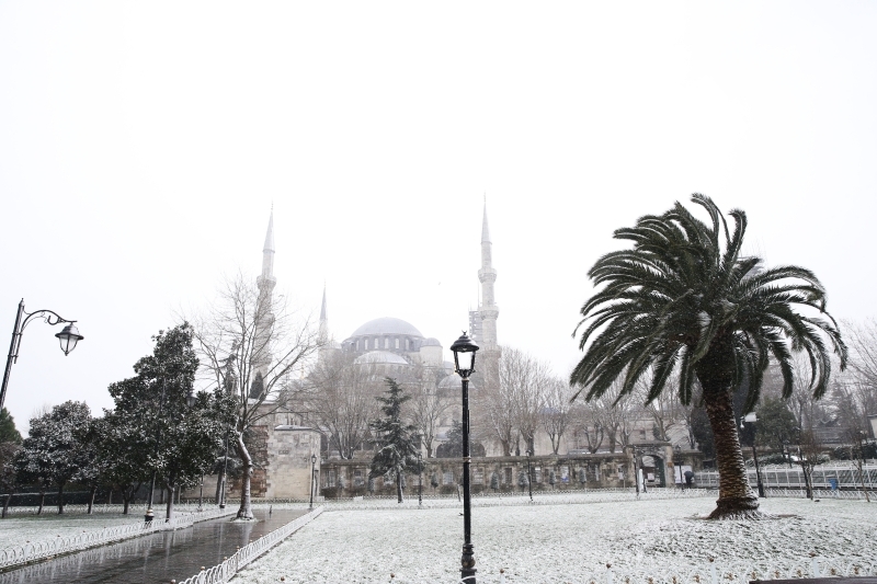 Eminönü'ndeki Yeni Cami, Sultanahmet Meydanı ve Ayasofya-i Kebir Cami-i Şerifi çevresinde de de kar yağışı etkili oldu.