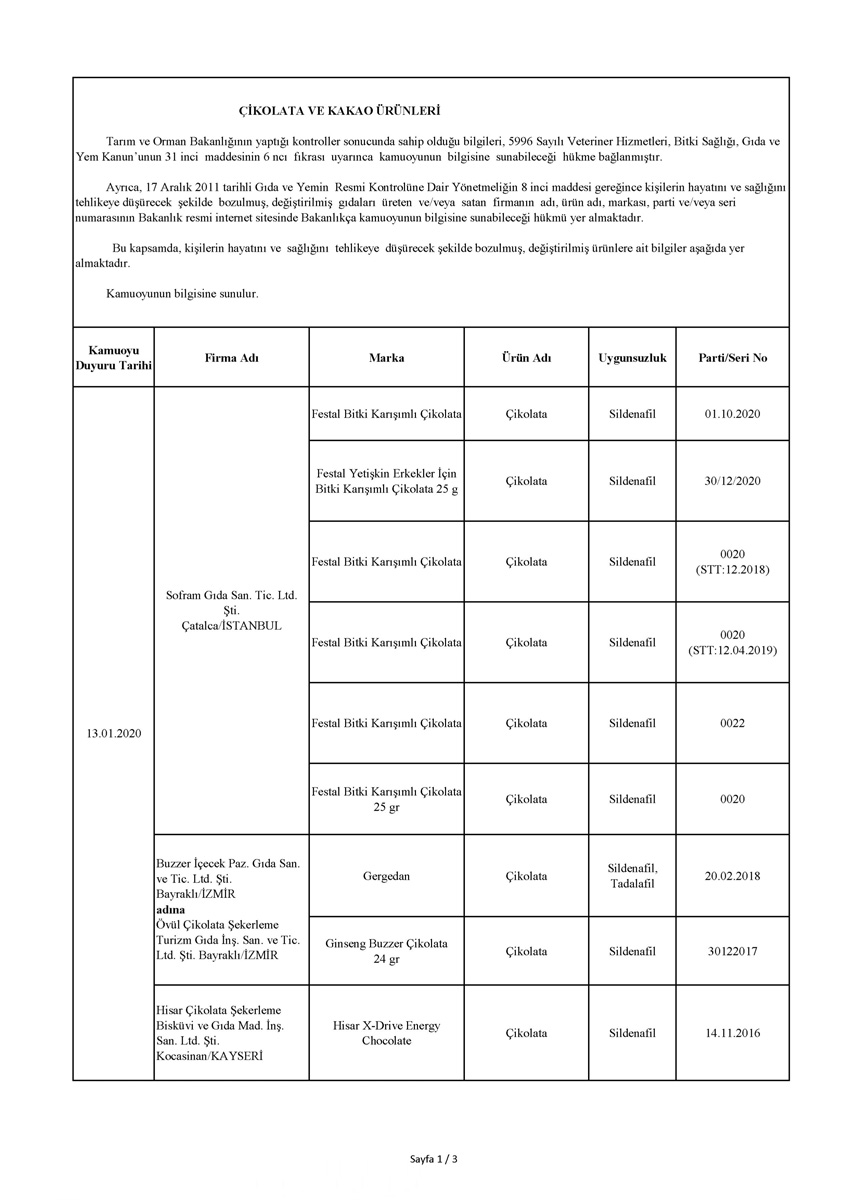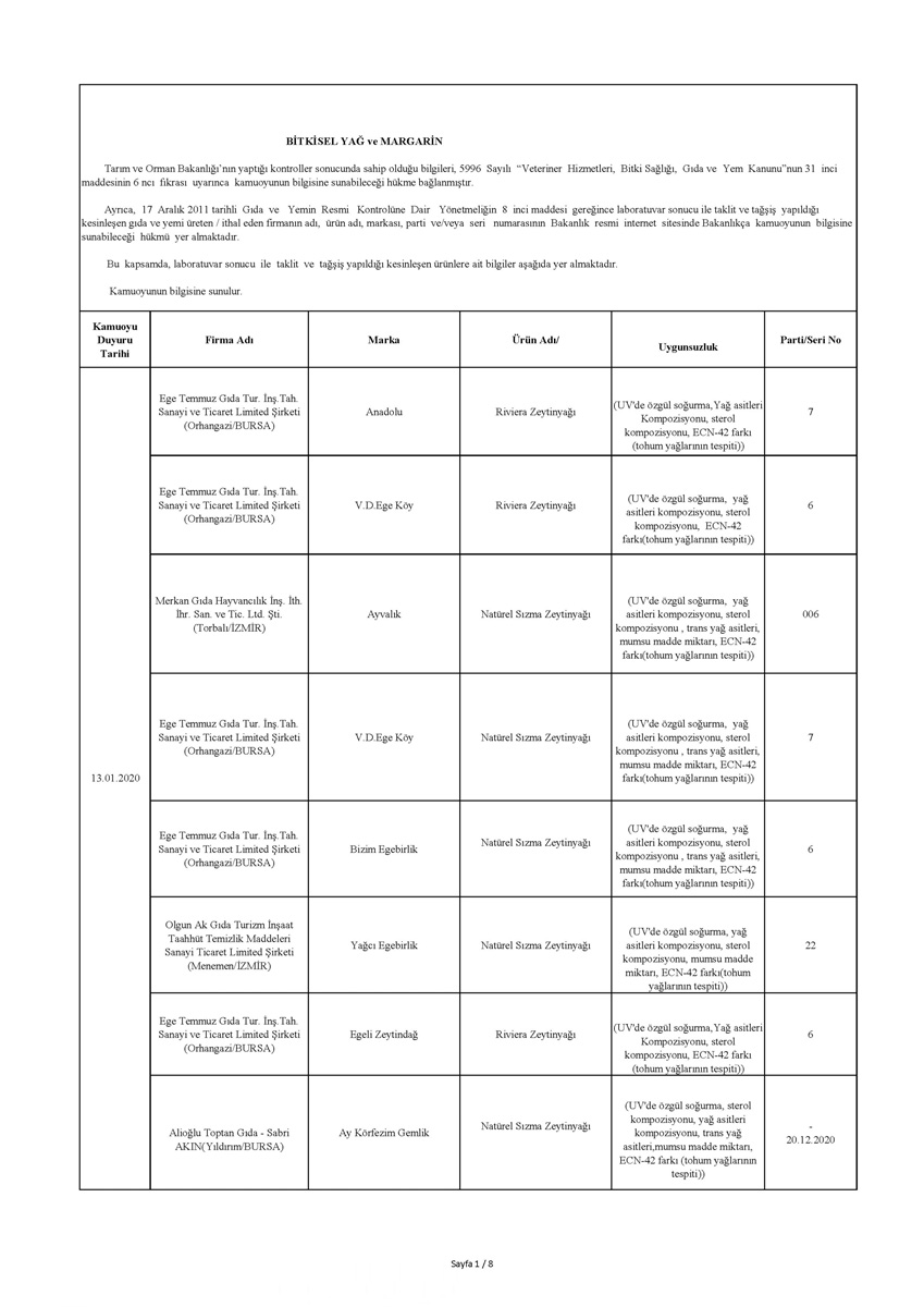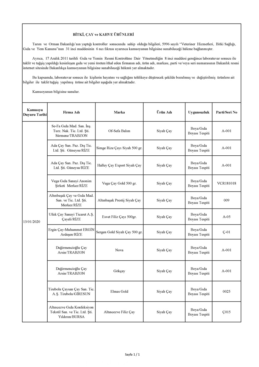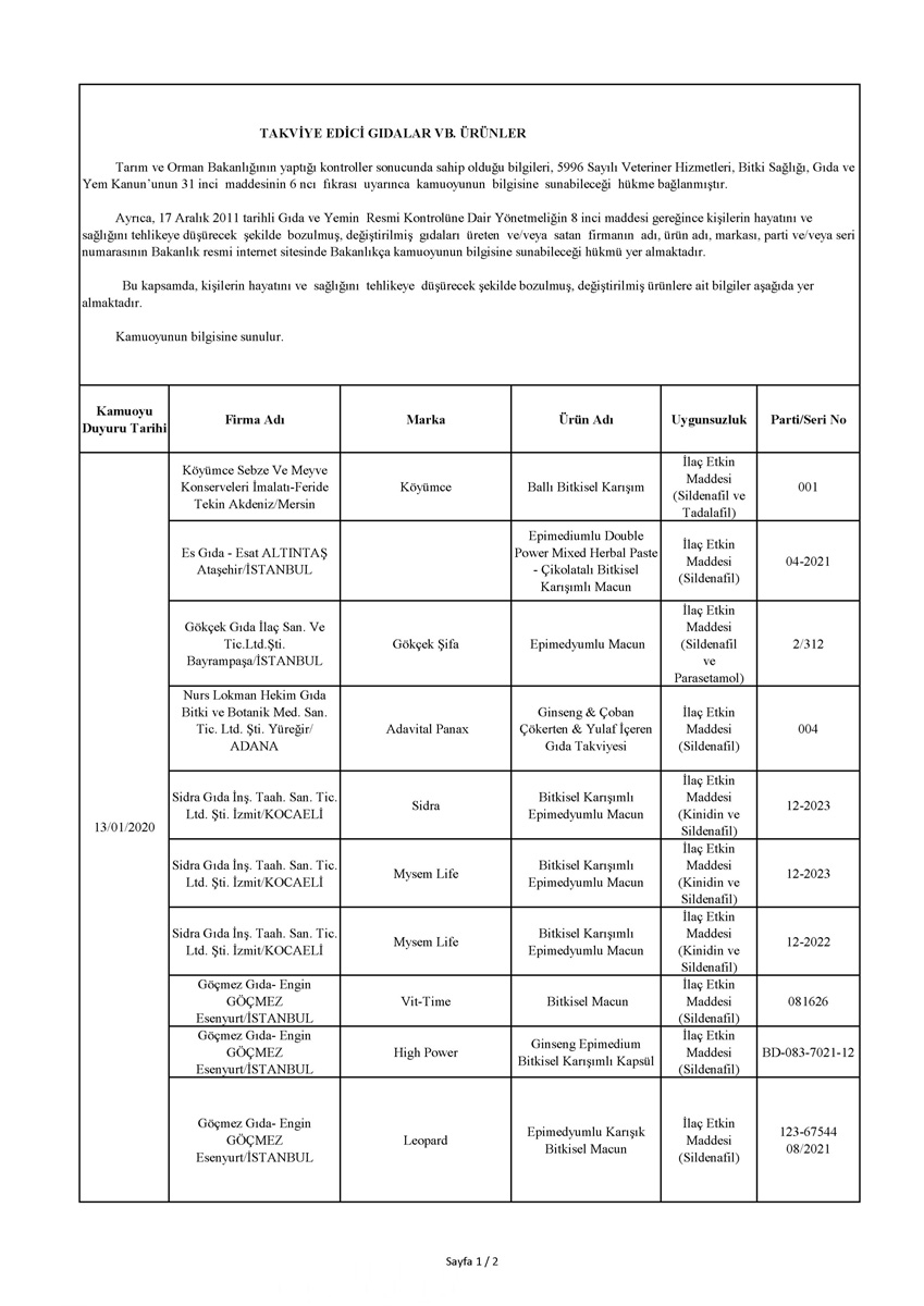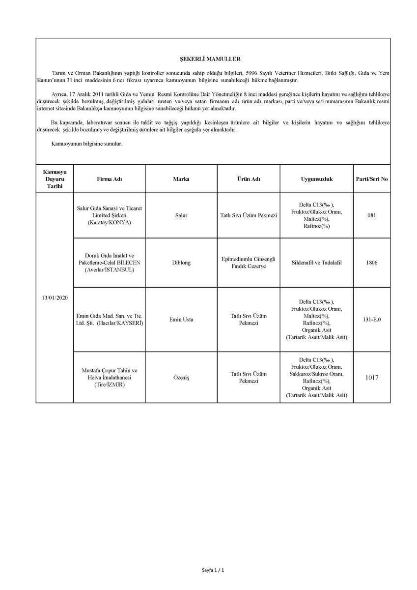 Tarım ve Orman Bakanlığı, taklit, tağşiş veya ilaç etken maddesi tespit edilen toplam 229 firmaya ait 386 parti ürünü kamuoyuyla paylaştı.