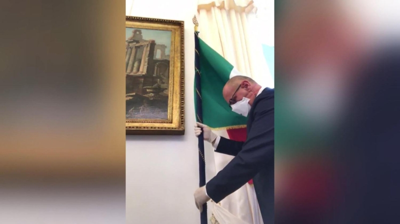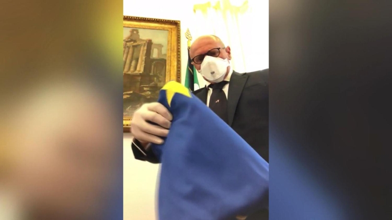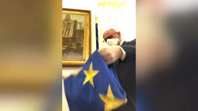 Rampelli, odasında bulunan Avrupa Birliği bayrağını kaldırdı...