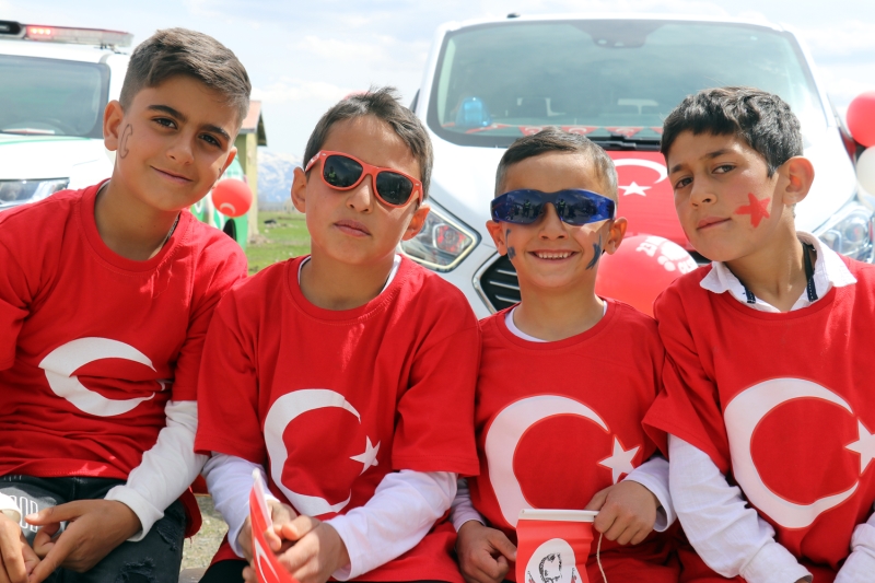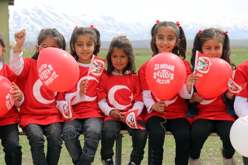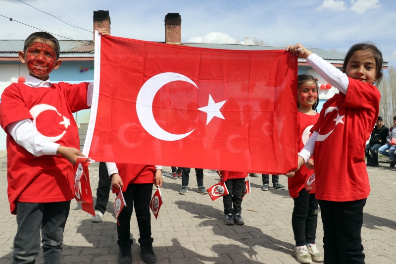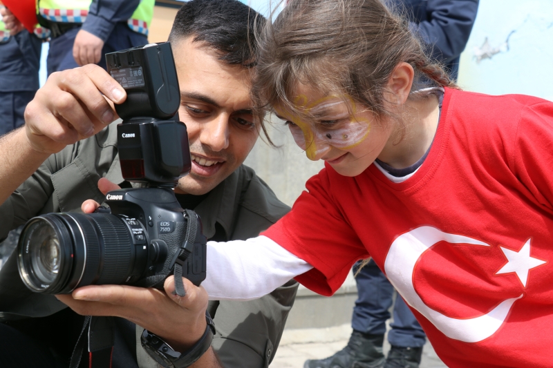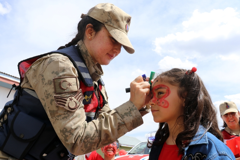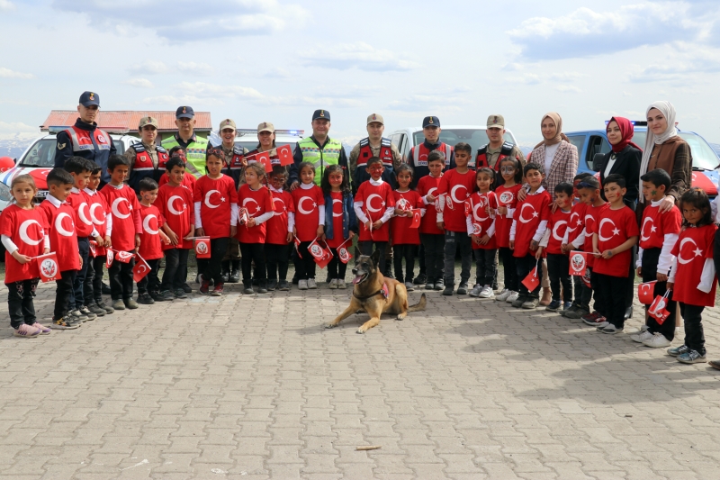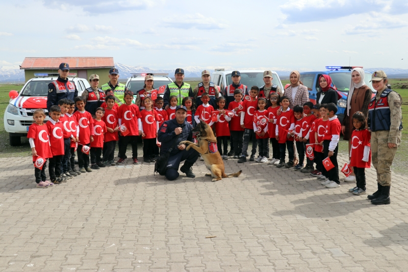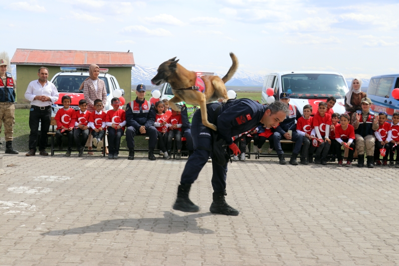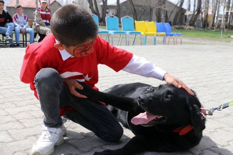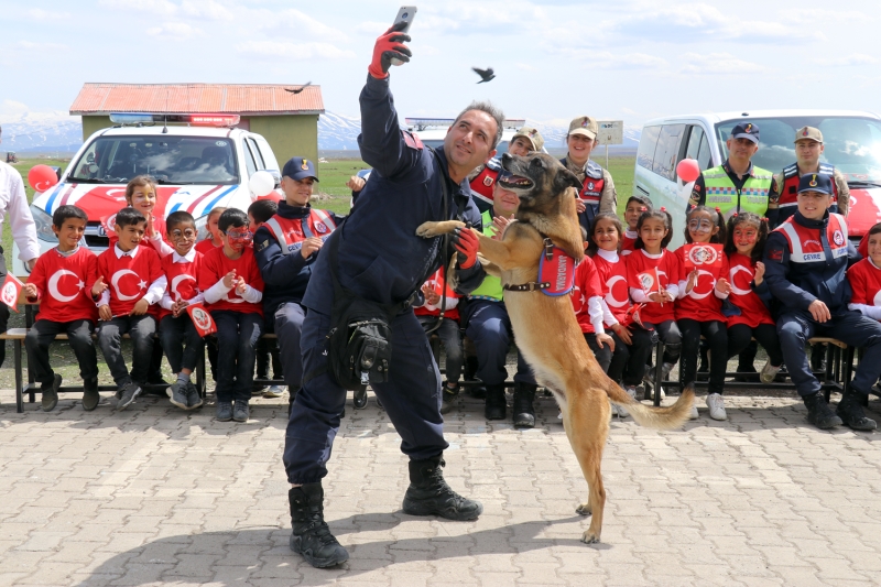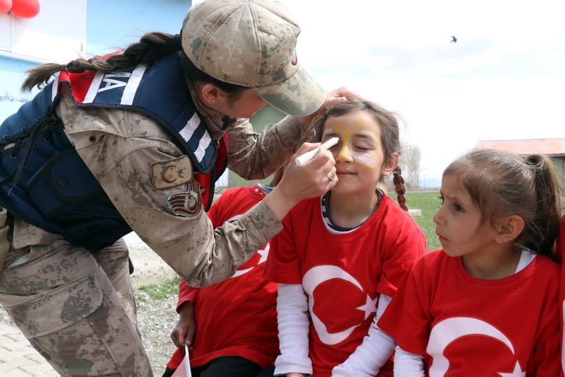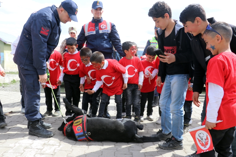 Ağrı'da jandarma ekipleri, 23 Nisan Ulusal Egemenlik ve Çocuk Bayramı kapsamında ziyaret ettikleri köy okulunda öğrencilerin yüzlerini boyayıp eğitimli köpeklerle gösteri düzenleyerek bayramlarını kutladı. Jandarma ekipleri 'Dağ' isimli bomba arama köpeği ve 'Kilit' isimli mayın arama köpeğiyle öğrencilere gösteri yaptı.