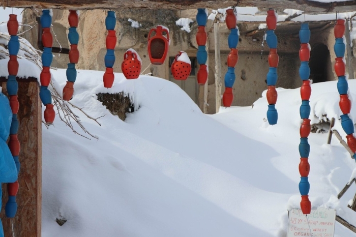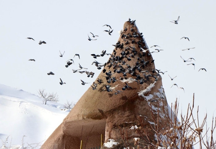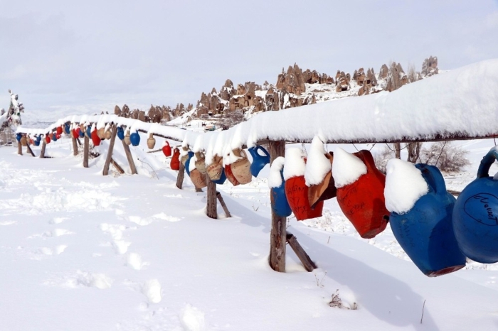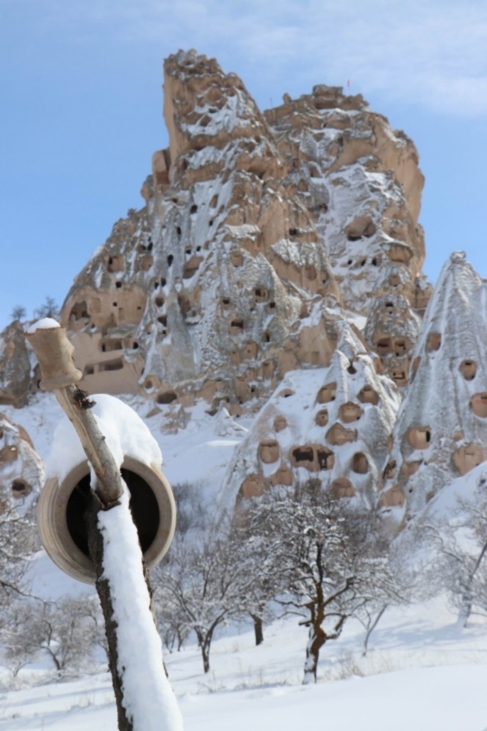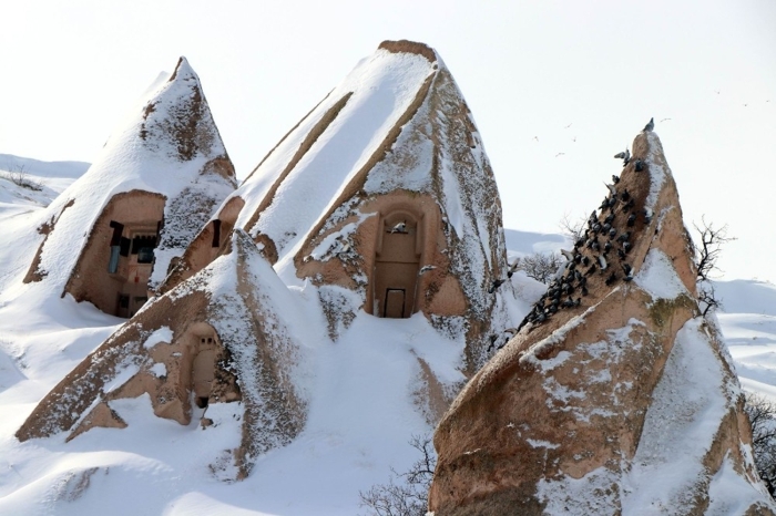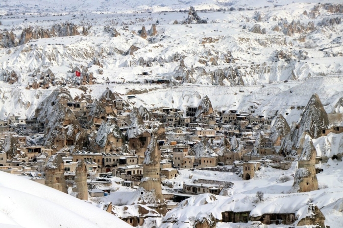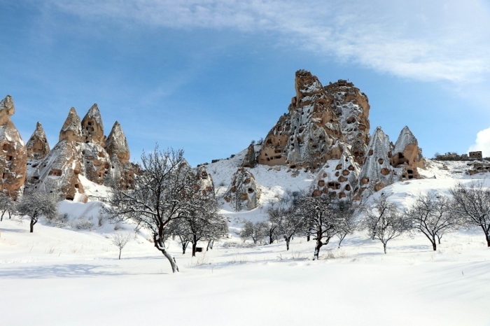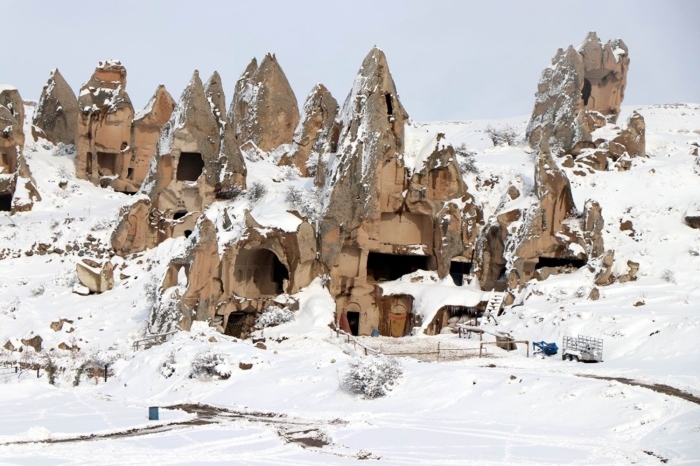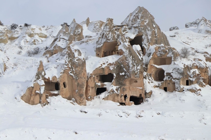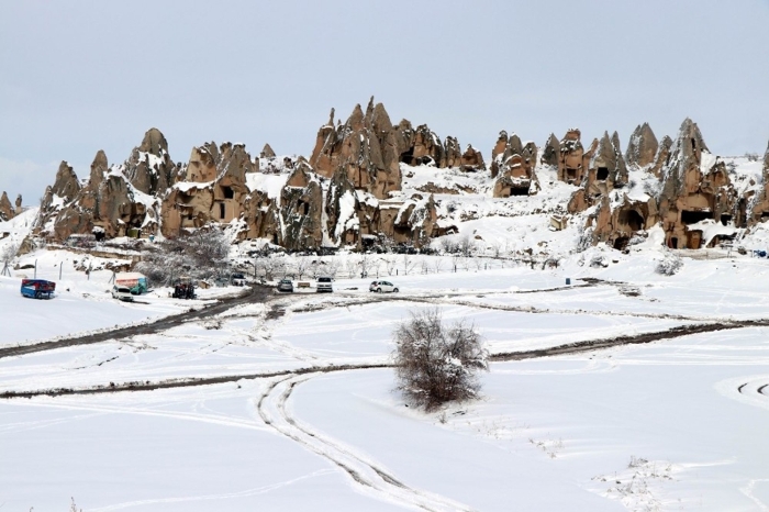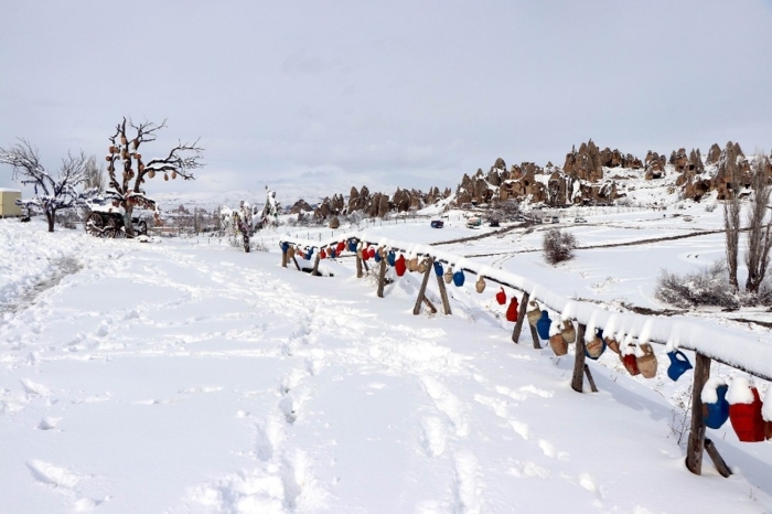 Nevşehir merkez ilçeye bağlı Uçhisar ve Göreme beldelerinde peribacaları karla kaplandı.