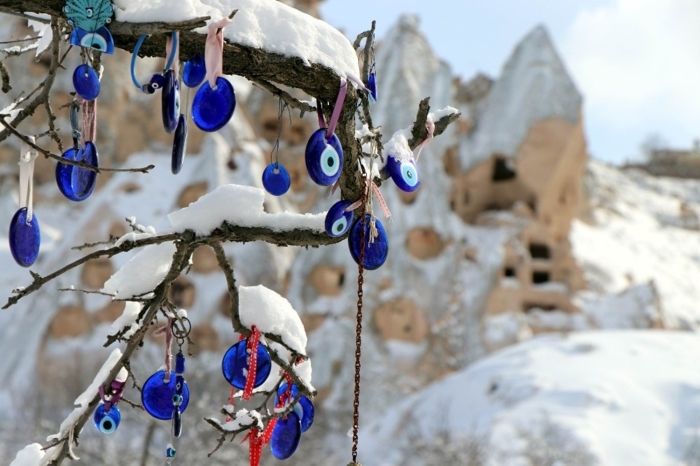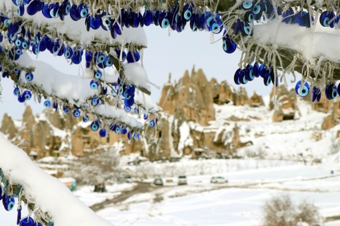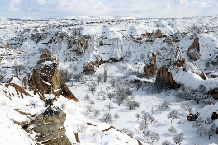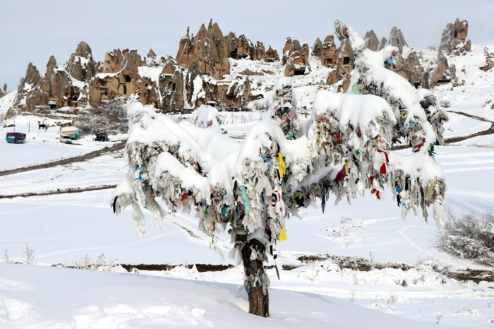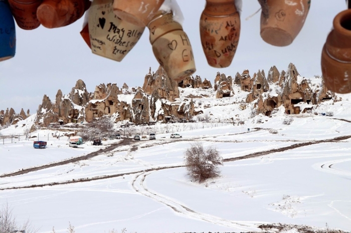Karlarla kaplı peribacaları kartpostallık görüntüler verdi.