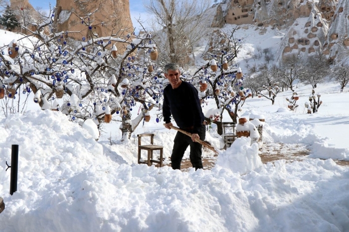 Türkiye'nin önemli turizm merkezlerinden Kapadokya bölgesinde yağan kar yağışının ardından peribacalarının masalsı görüntüleri kendisine bir kez daha hayran bıraktı.