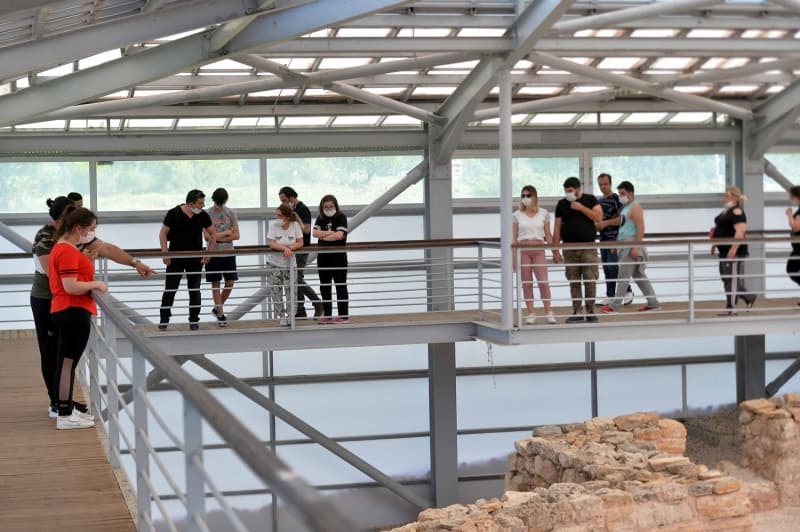 Kilise-C'nin üstü kapatılarak tabanlarındaki mozaiklerin sergilendiği antik kente gelen tarih meraklıları, rehber eşliğinde bilgilendiriliyor.