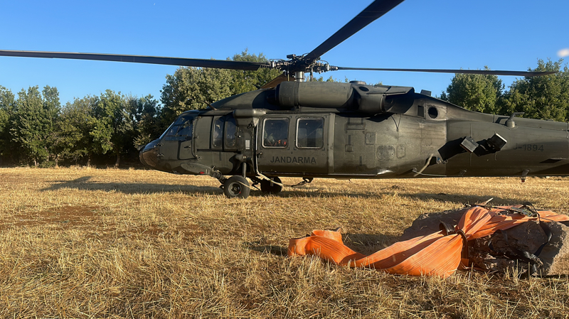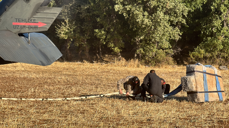 Sabah saatlerinde havalanan askeri helikopter alana ulaşarak halatlar yardımıyla tonlarca ağırlıktaki eserleri alarak Gölyurt köyü Kartal Yaylası kırsalına bıraktı.