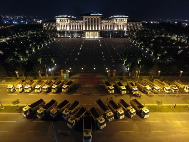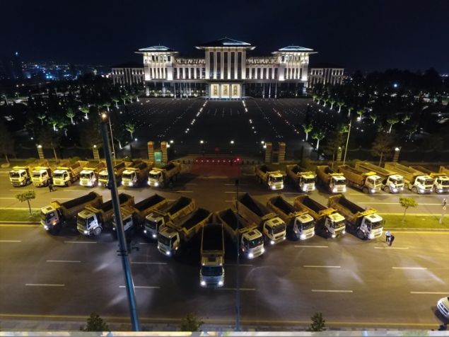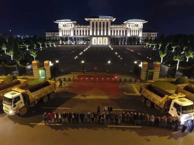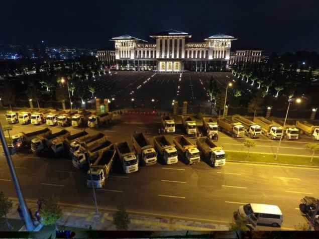 Cumhurbaşkanı Erdoğan'ın düzenlediği iftara katılan kamyoncuların araçlarını Cumhurbaşkanlığı Külliyesi'nin önüne park etmeleri, 15 Temmuz 2016'daki darbe girişimi sırasında yaşananları anımsattı.