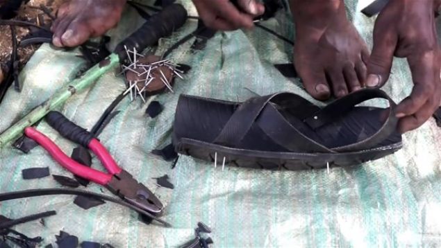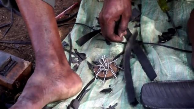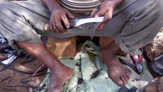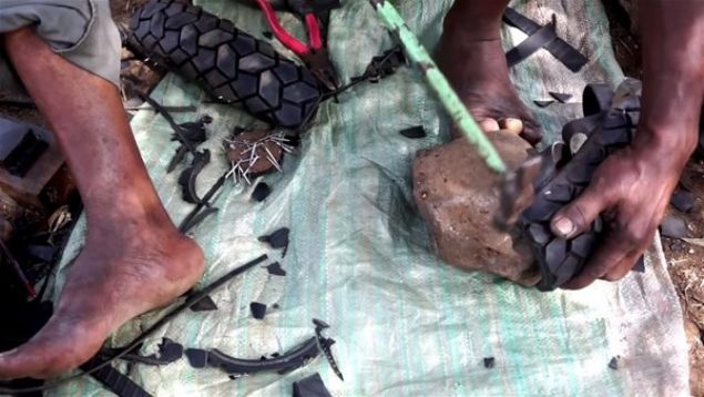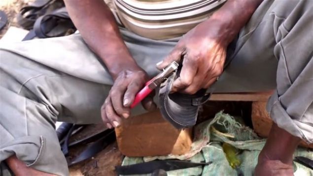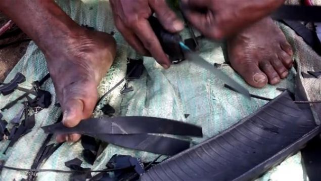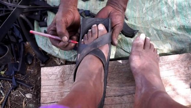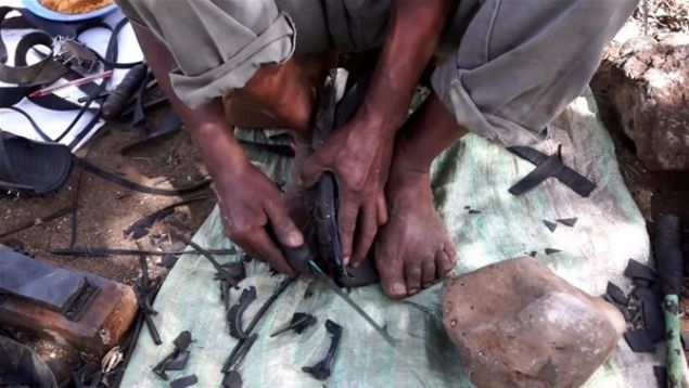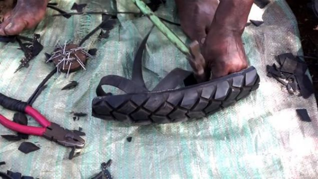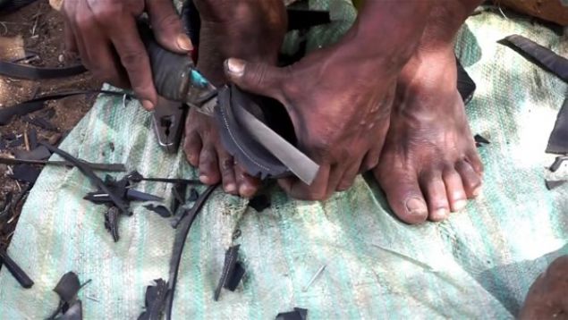 İmkanların sınırlı olduğu yerleşim yerlerinde insanların geçim kaynaklarından biri de kullanılmayan araç lastiklerinden ayakkabı yapmak!