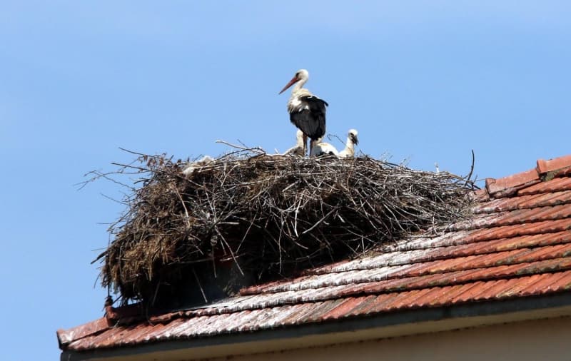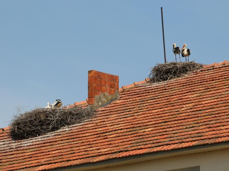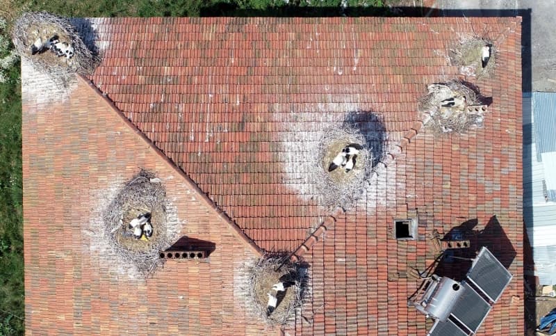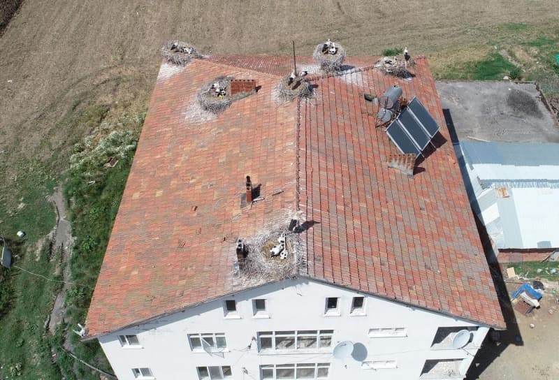 Leylekler ağaçların yanı sıra, elektrik direkleri ve evlerin çatılarına da yuvalarını kuruyor.