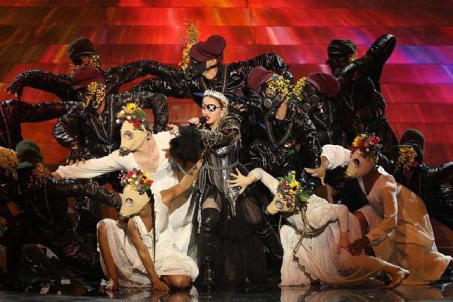 Madonna, dünyanın dört bir tarafından yapılan boykot çağrılarına rağmen sahne aldığı Eurovision finalinde dansçılarıyla dostluk mesajı verdi.