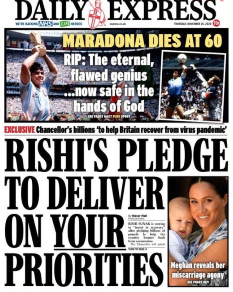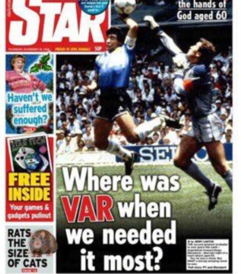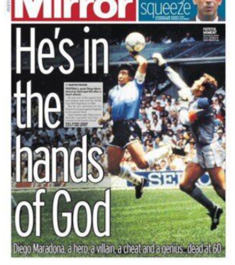 Ada'da yayımlanan bazı gazeteler, Maradona'nın vefat haberini 1986 Dünya Kupası'nın unutulmaz simgesi haline gelen ve futbol dünyasında 'Tanrının eli' olarak yer edinen meşhur golüyle verdi.