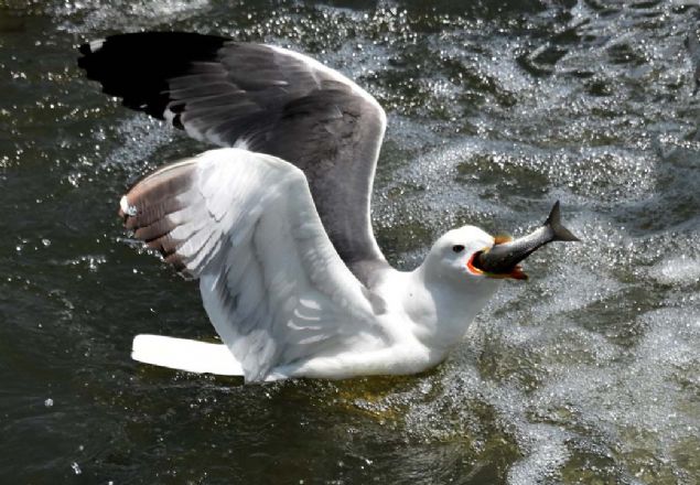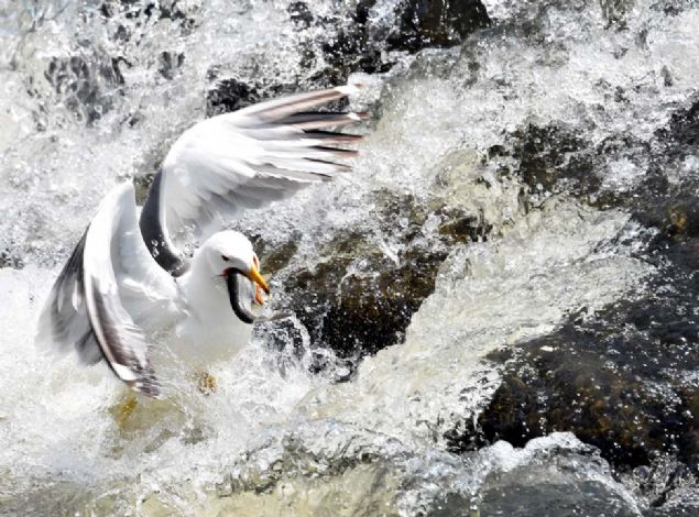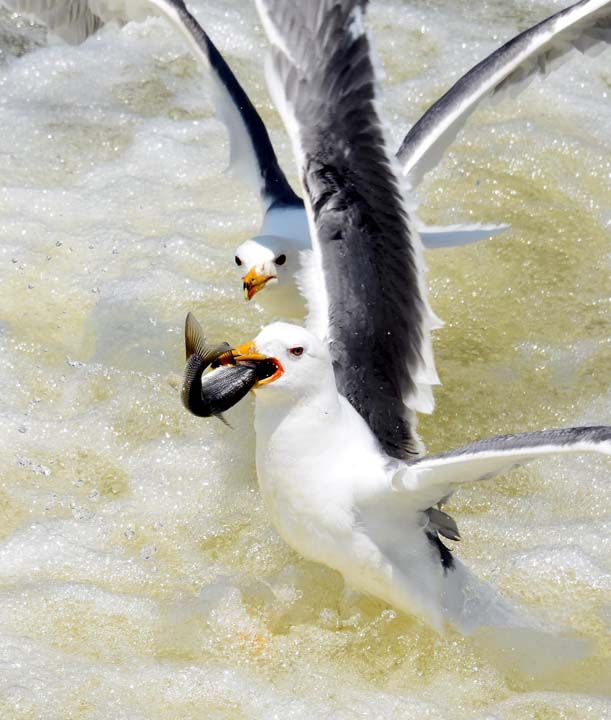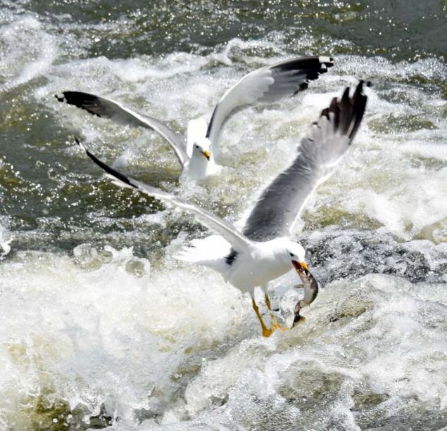 İnci kefalleri nesillerini devam ettirebilmek için yoğun çaba harcarken, martılar da karınlarını doyurmaya çalışıyor.