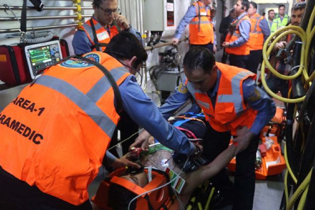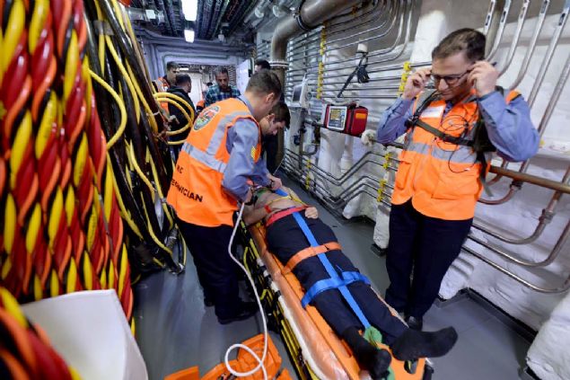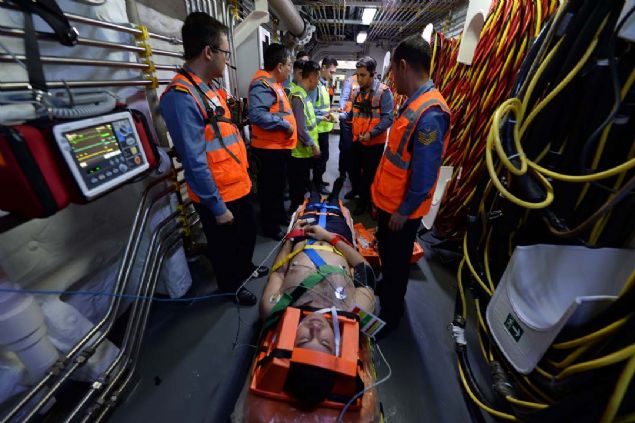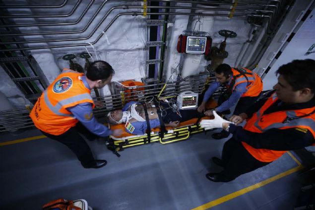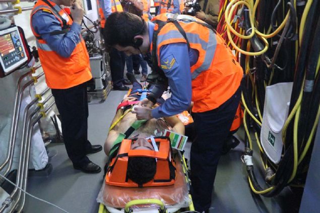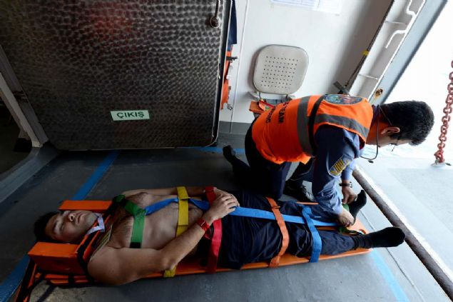 Denizaltı kurtarma senaryosunda gemiye getirilen kazazedelerin tıbbi tasnifi yapılarak ilgili tedavi alanlarına yönlendirildi.