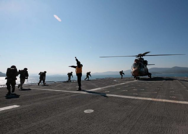 Temsili düşman plajının temizlenmesinin ardından botlara binen amfibi deniz piyade birlikleri, adaya çıkarma yaptı.