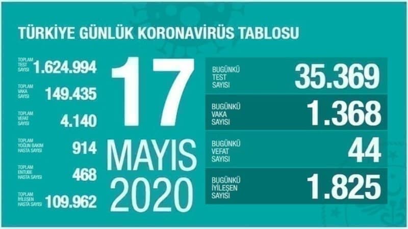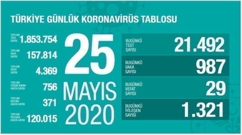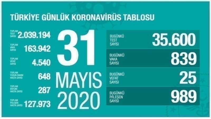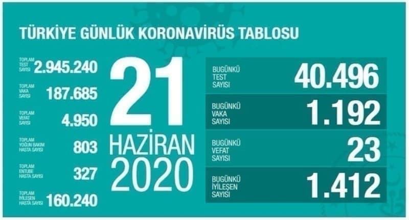 Türkiye Günlük Koronavirüs Tablosu'nu göre; son 24 saatte 45 bin 176 test yapıldı, 1562 kişiye daha koronavirüs teşhisi konuldu. Virüs nedeniyle 15 kişi yaşamını yitirirken, 1330 kişi de iyileşti. Dünkü verilerle, toplam test sayısı 2 milyon 632 bin 171, toplam vaka sayısı 178 bin 239, toplam vefat sayısı 4 bin 807, toplam yoğun bakım hasta sayısı 717, solunum cihazına bağlı toplam hasta sayısı 290, toplam iyileşen hasta sayısı 151 bin 417 oldu.