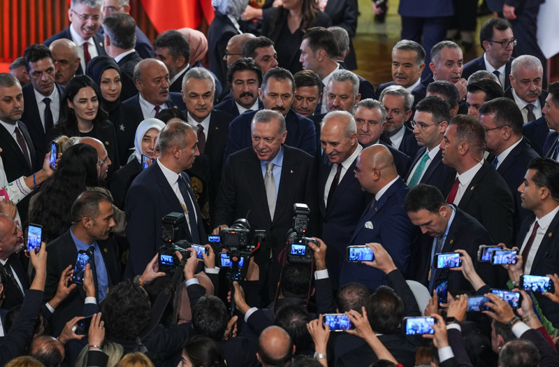 TBMM Başkanı Numan Kurtulmuş, yeni yasama yılı dolayısıyla TBMM Tören Salonu'nda resepsiyon verdi. Resepsiyona Cumhurbaşkanı Recep Tayyip Erdoğan da katıldı. Resepsiyona katılan Cumhurbaşkanı Erdoğan milletvekilleri ve davetlilerle selamlaştı.