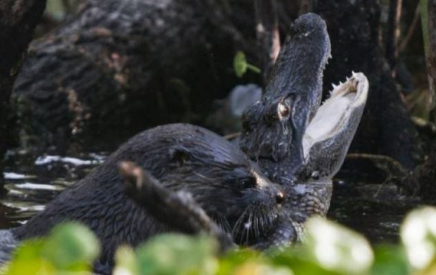 Woodruff Vahşi Yaşam Parkında yaşayan bir su samuru timsahı timsaha saldırdı...
