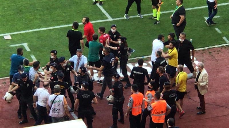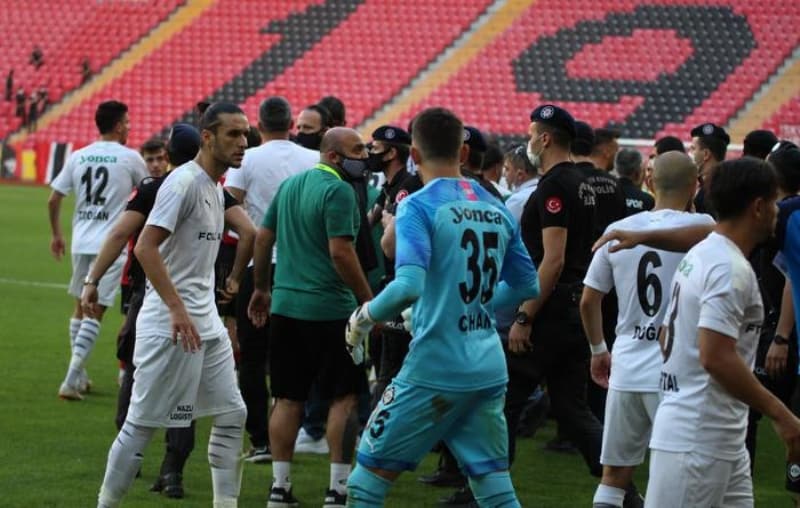Bu esnada saha kenarında bir anda ortalık karıştı. İki takım teknik heyeti ve futbolcuları adeta birbirine girerek yumruklaşmaya başladı.