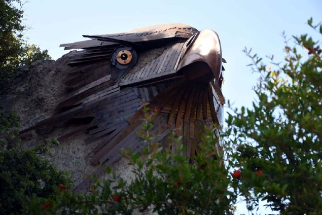Muğla'nın Bodrum ilçesinde, ressam ve heykeltıraş Rıfat Koçak'ın hurdaya ayrılmış otomobil ve diğer metal parçalardan yapıp kaya üzerine monte ettiği 'kartal kafası heykeli' ilgi görüyor.