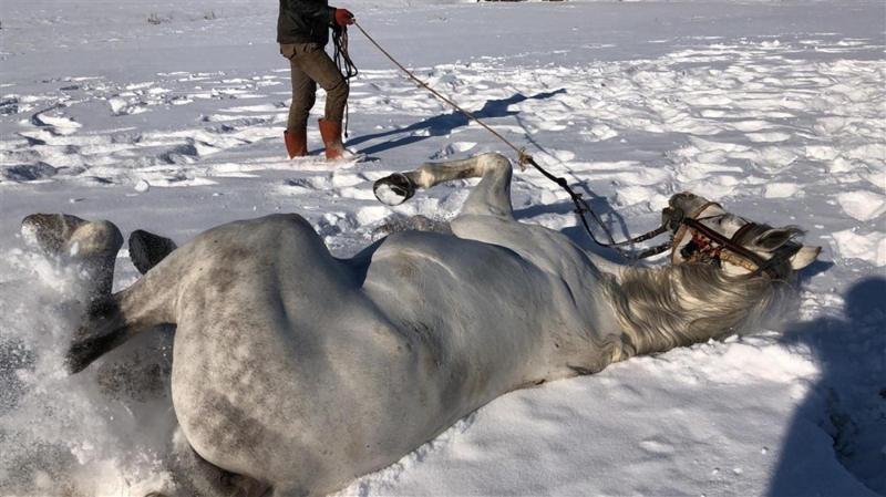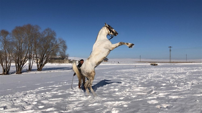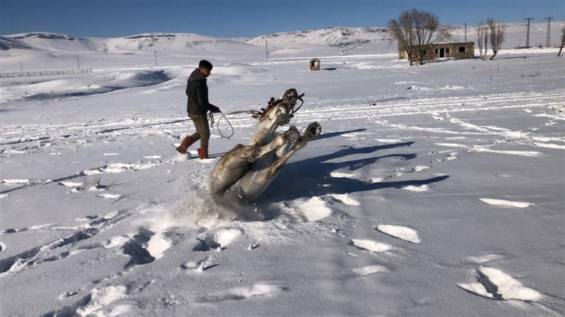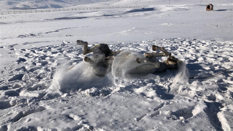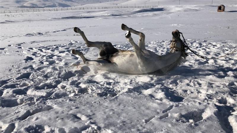 Kars Kafkas Atlı Spor Kulübü'nün meşhur atı 'Poyraz', karların üzerinde uzun süre yuvarlandı.