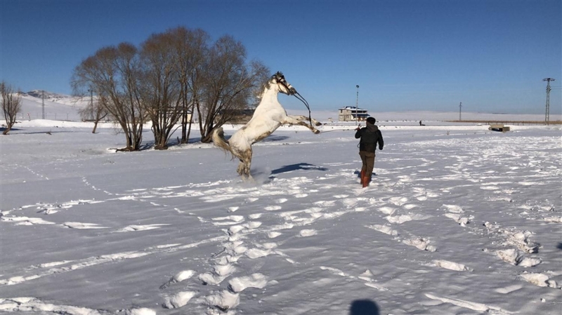Selim ilçesine bağlı Kekeç köyünde cirit atı 'Poyraz'ın, şaha kalktığında ön ayaklarını birbirine vurması, ilginç görüntüler oluşturdu.