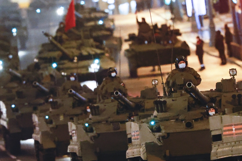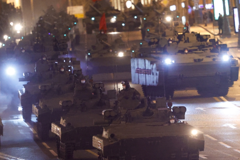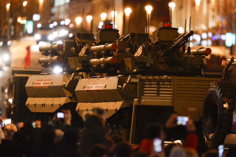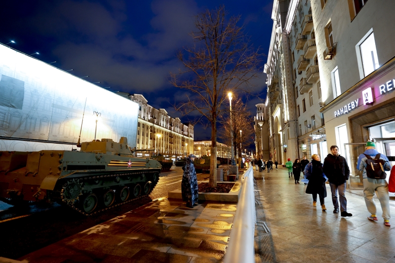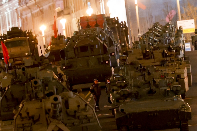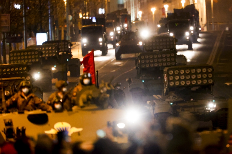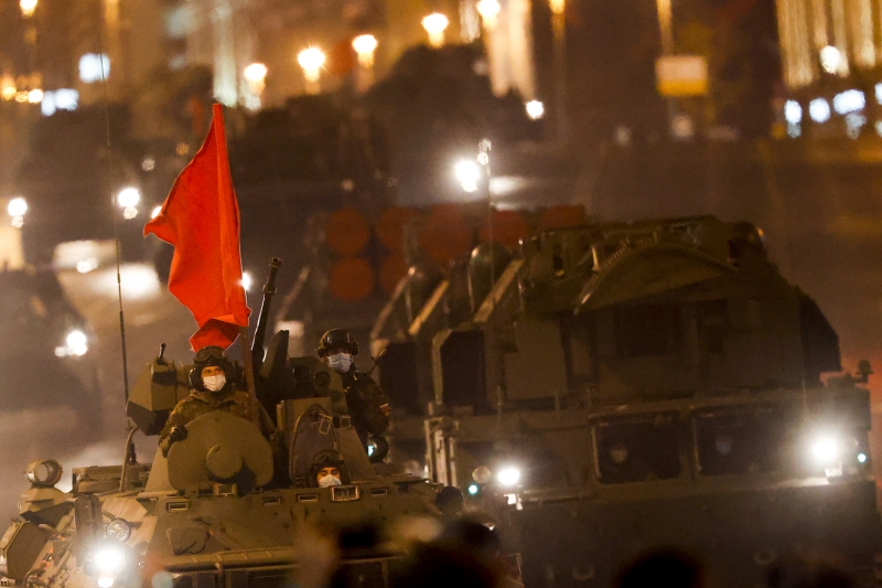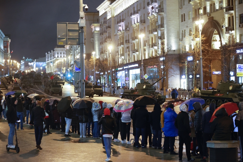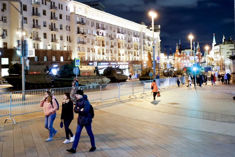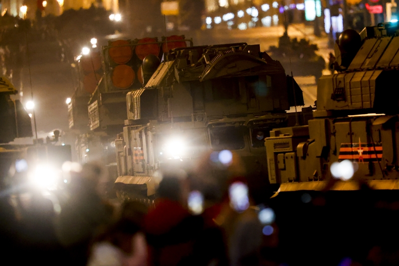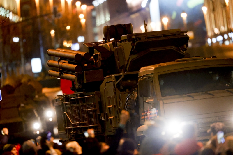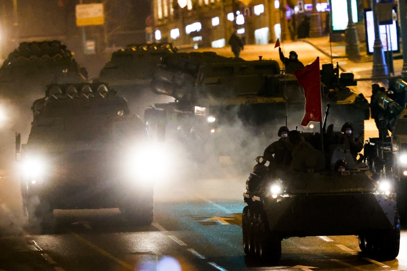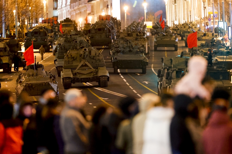 Rus askeri araçları, Tarihi Kızıl Meydan'daki geçit törenine Tverskaya Caddesi'nden geçerek ulaştı.