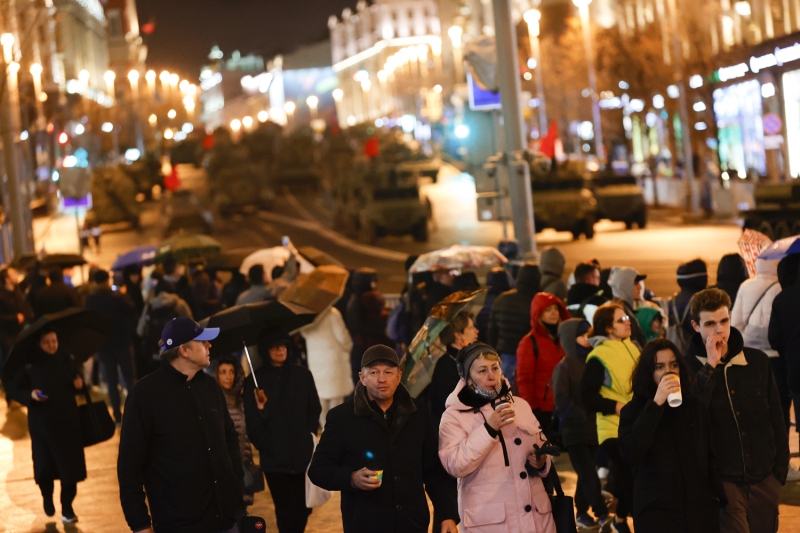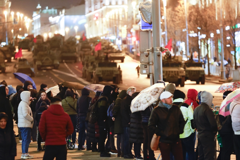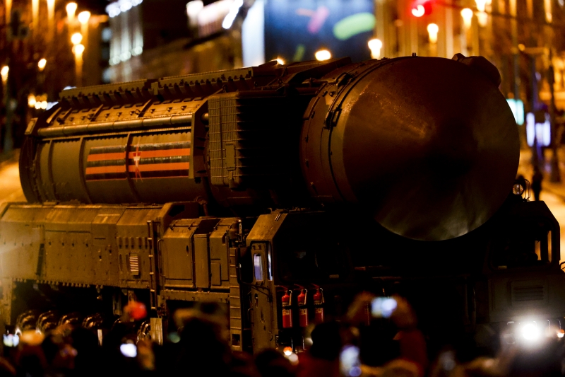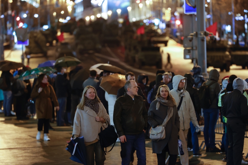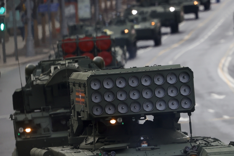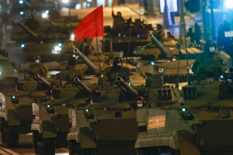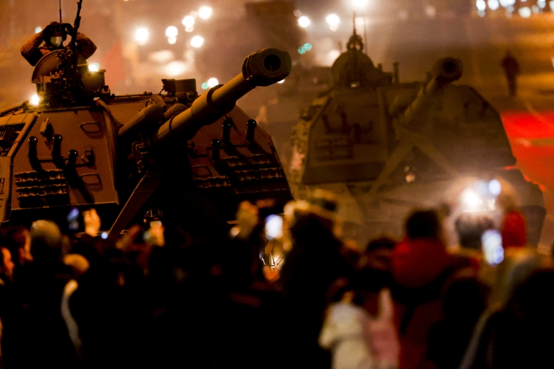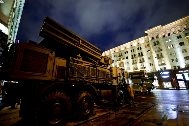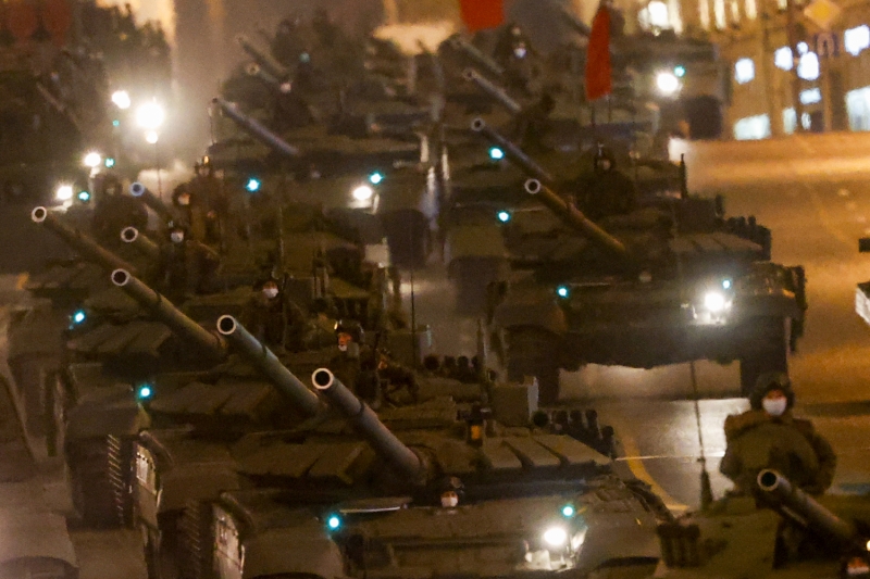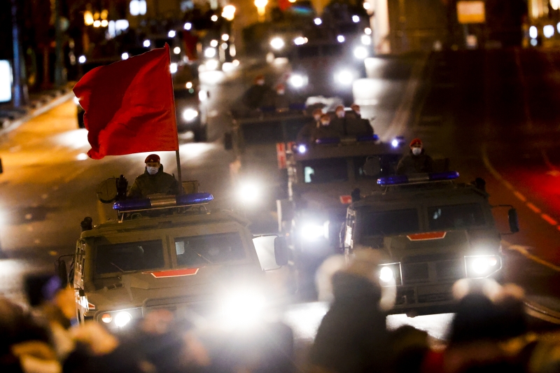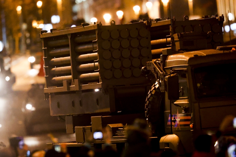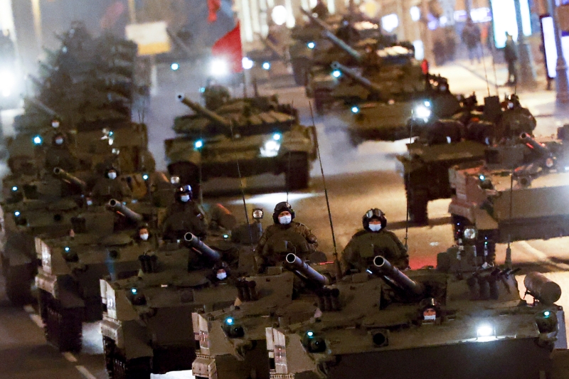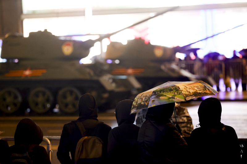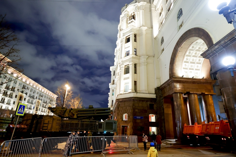 Rus askeri araçları, Tarihi Kızıl Meydan'daki geçit törenine Tverskaya Caddesi'nden geçerek ulaştı.