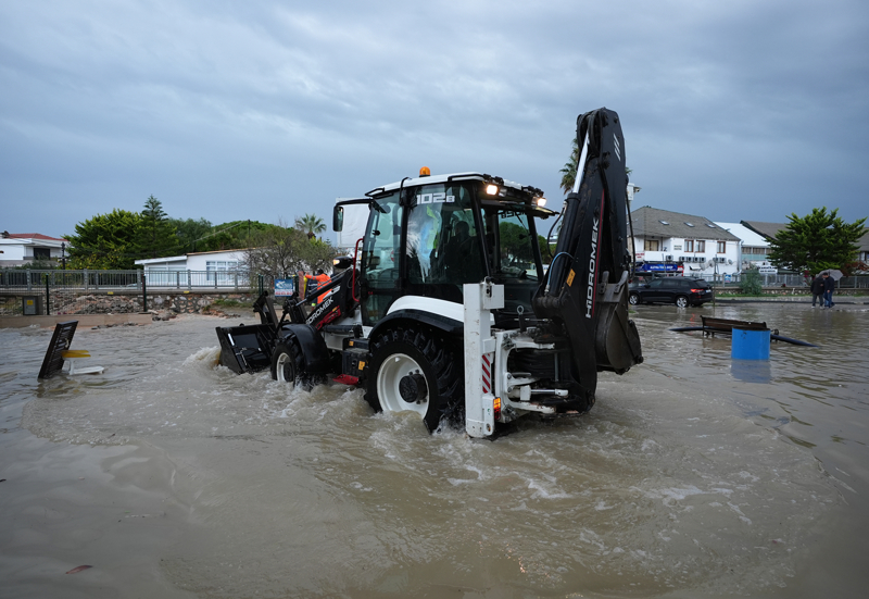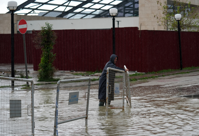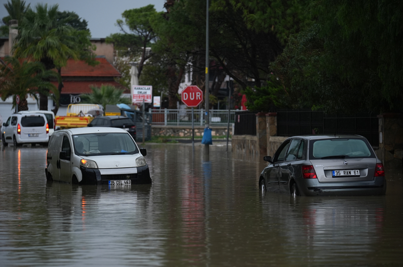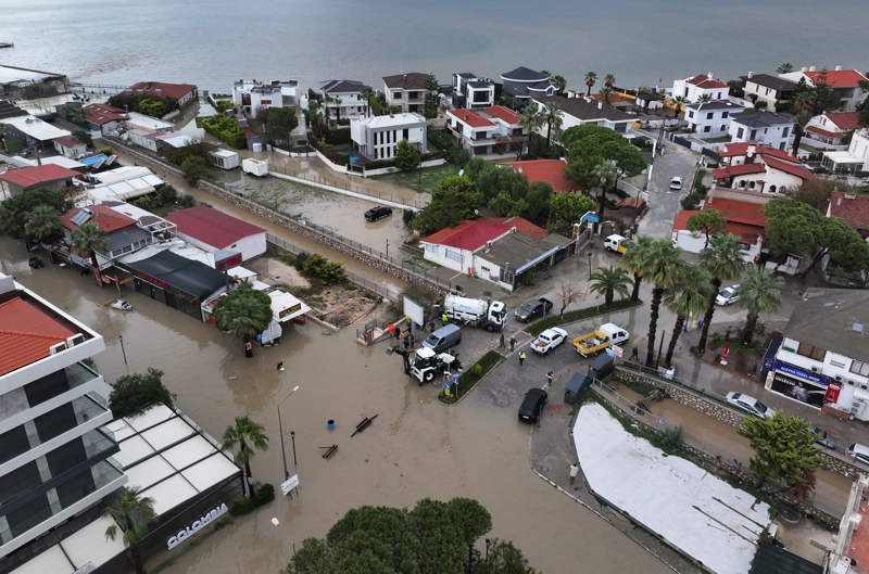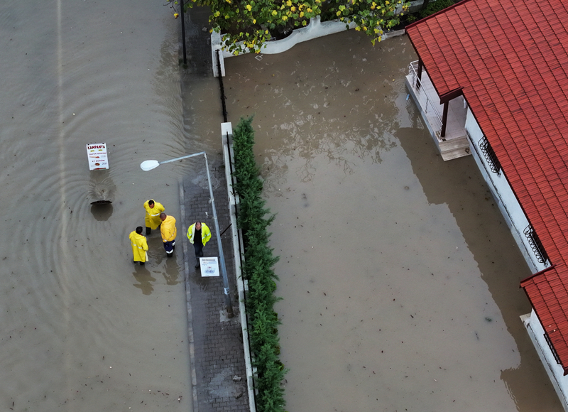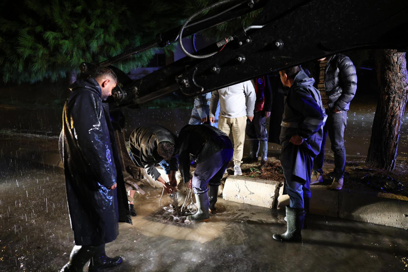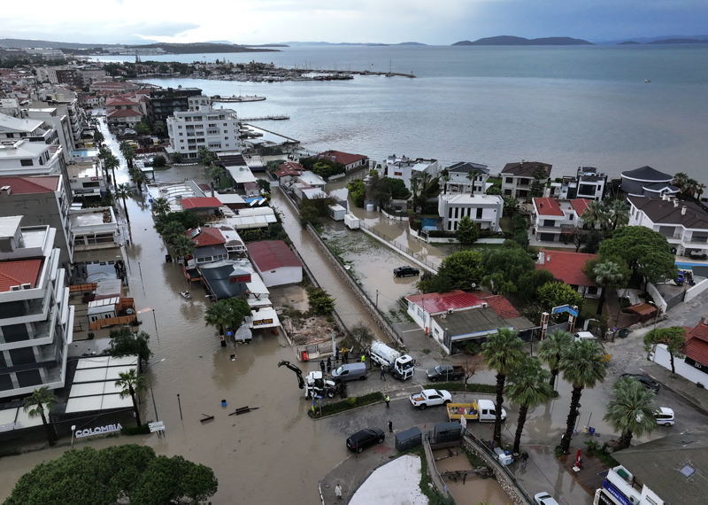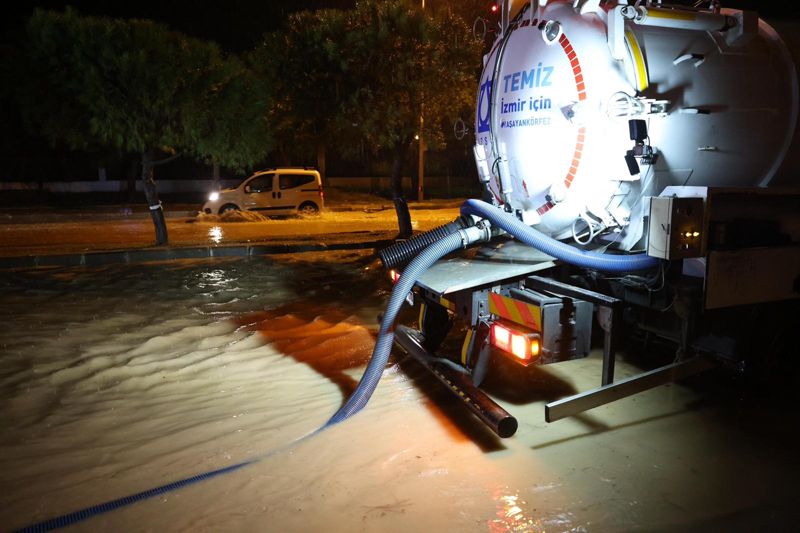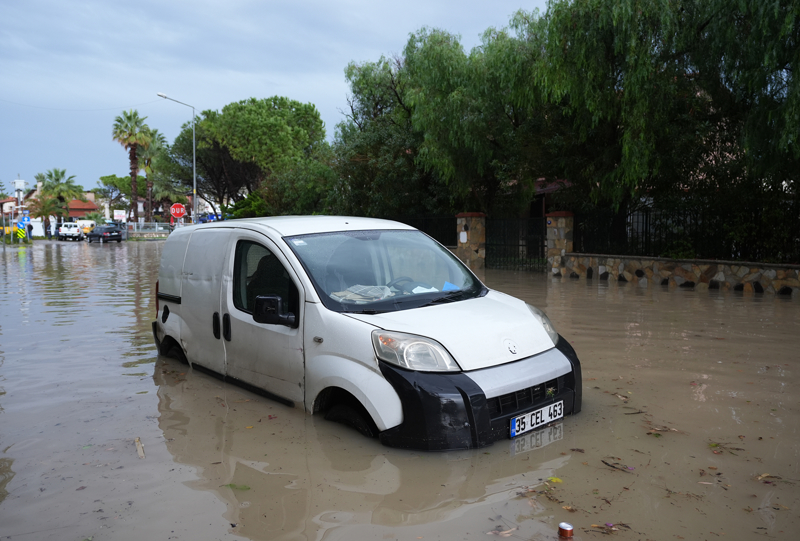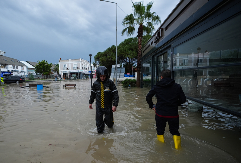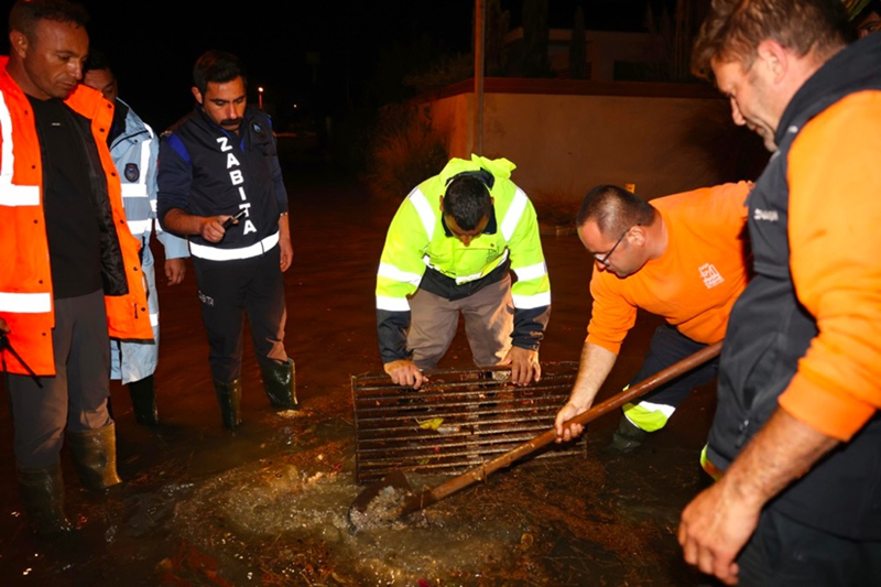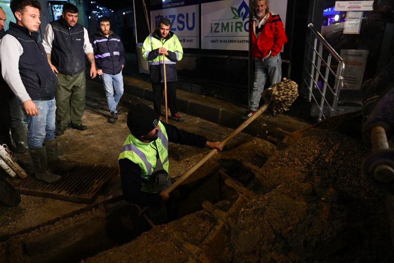 İzmir'in Çeşme ilçesinde kuvvetli sağanak nedeniyle cadde ve sokaklar göle döndü. Çeşme Belediyesi ekipleri, tıkanan rögar kapaklarını açarak suyu tahliye etmek için çalışma başlattı.