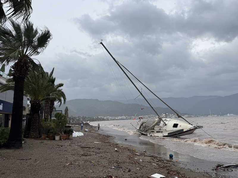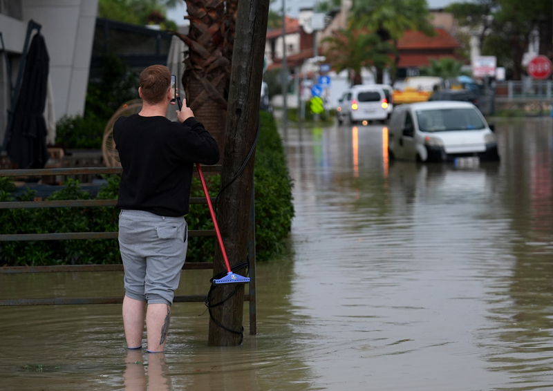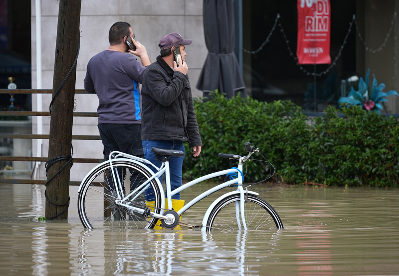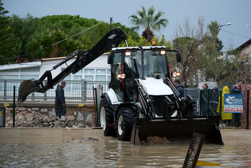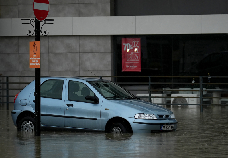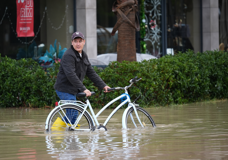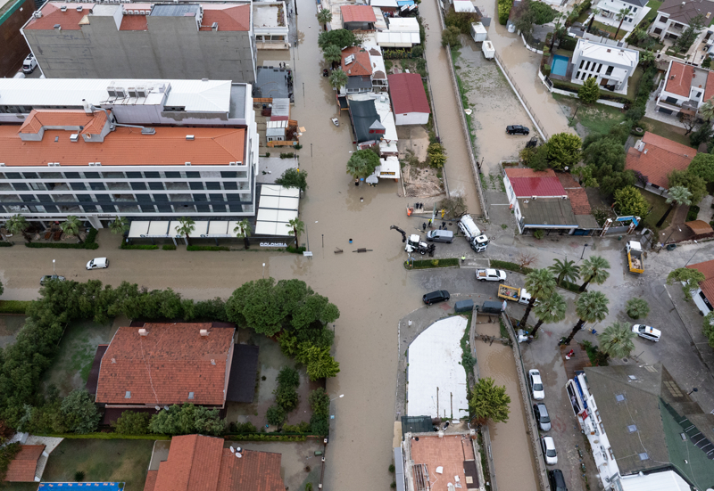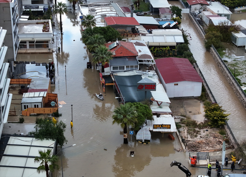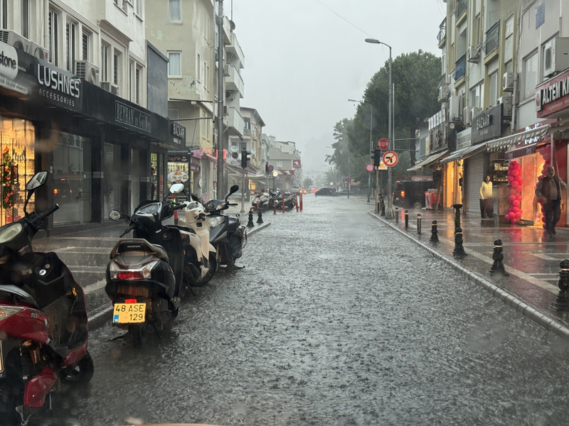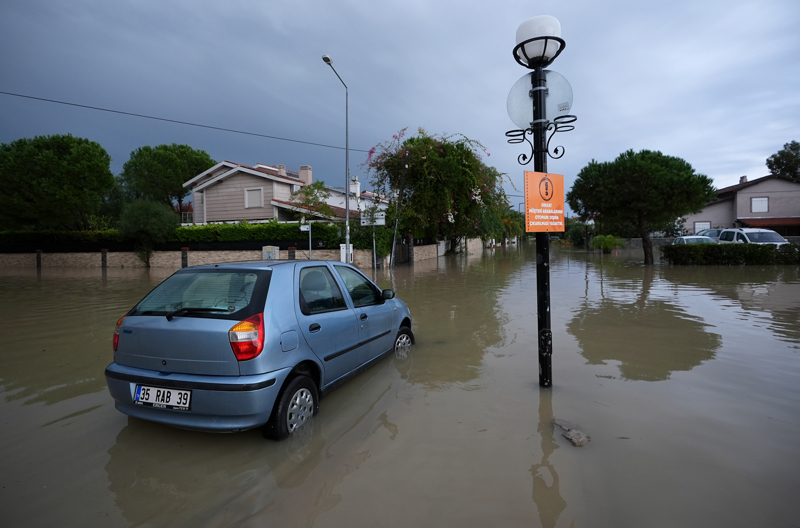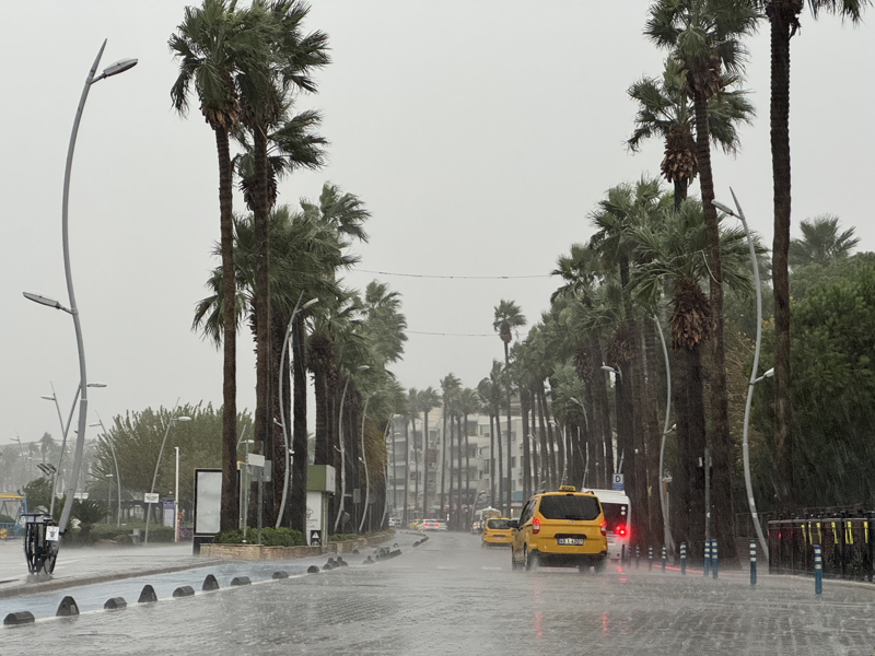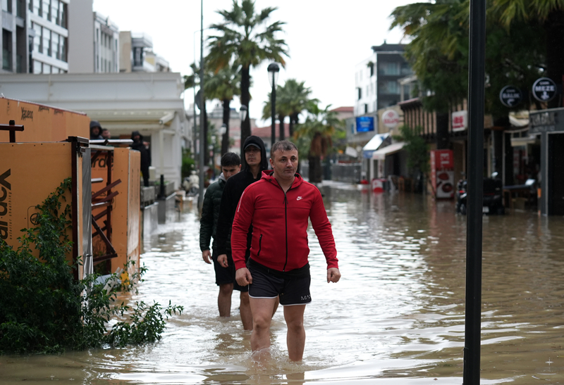 İzmir'in Çeşme ilçesinde kuvvetli sağanak nedeniyle cadde ve sokaklar göle döndü. Çeşme Belediyesi ekipleri, tıkanan rögar kapaklarını açarak suyu tahliye etmek için çalışma başlattı.