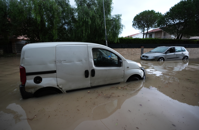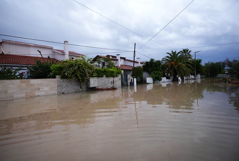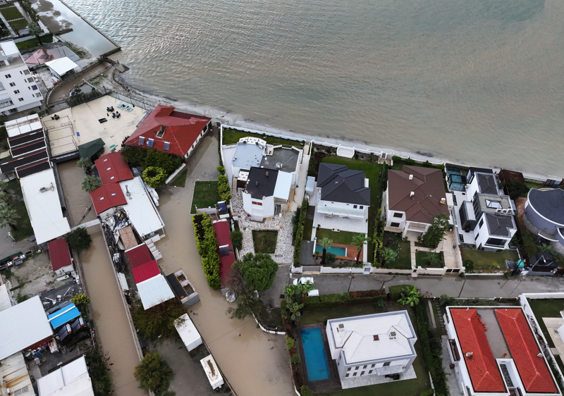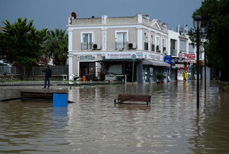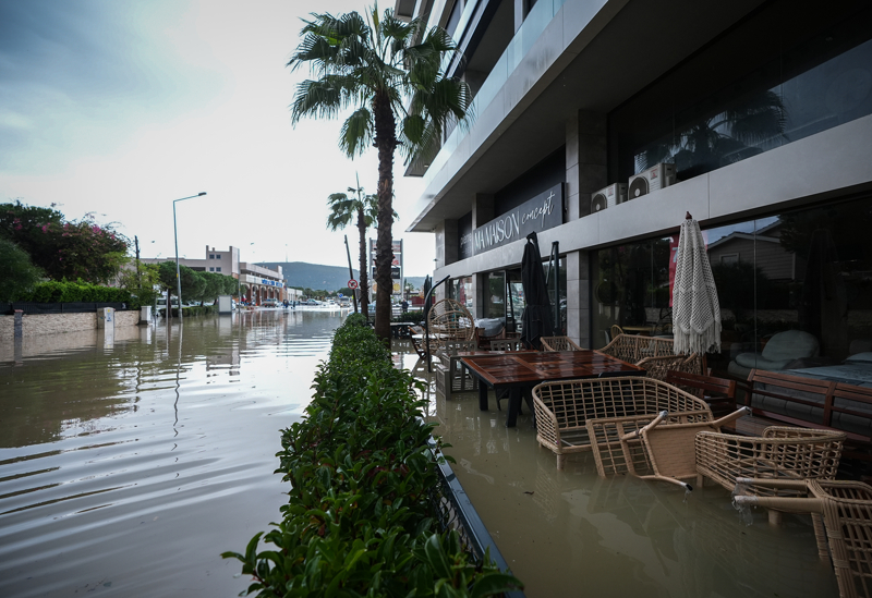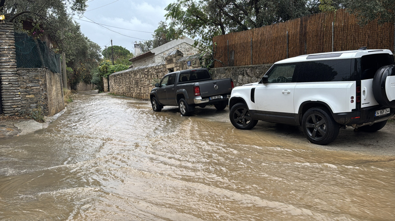 İzmir'in Çeşme ilçesinde kuvvetli sağanak nedeniyle cadde ve sokaklar göle döndü, bazı ev ve iş yerlerini su bastı.