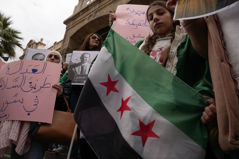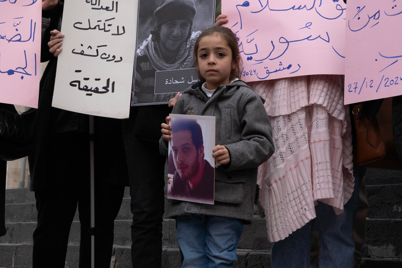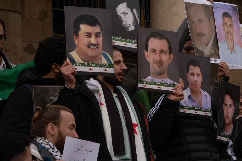 Gösteride 'Tutuklular nerede?, 'Sevdiklerimizin cesetleri nerede?', 'Zalimler hesap vermedikçe adalet sağlanmayacak', 'Suriye için adalet ve barış', 'Çocuklarımızın hakkını istiyoruz', 'Tüm delillerin korunmasını istiyoruz' yazılı dövizler yer aldı.