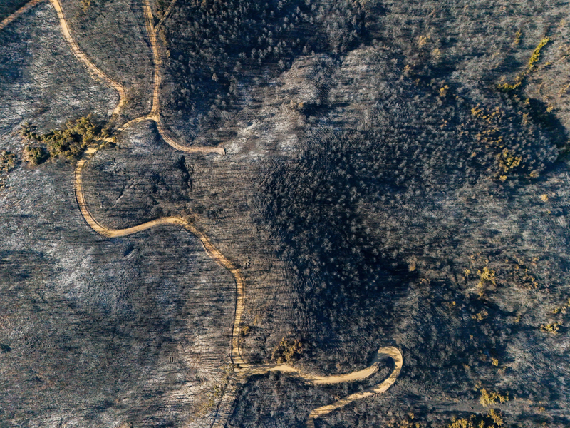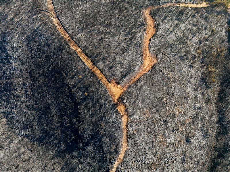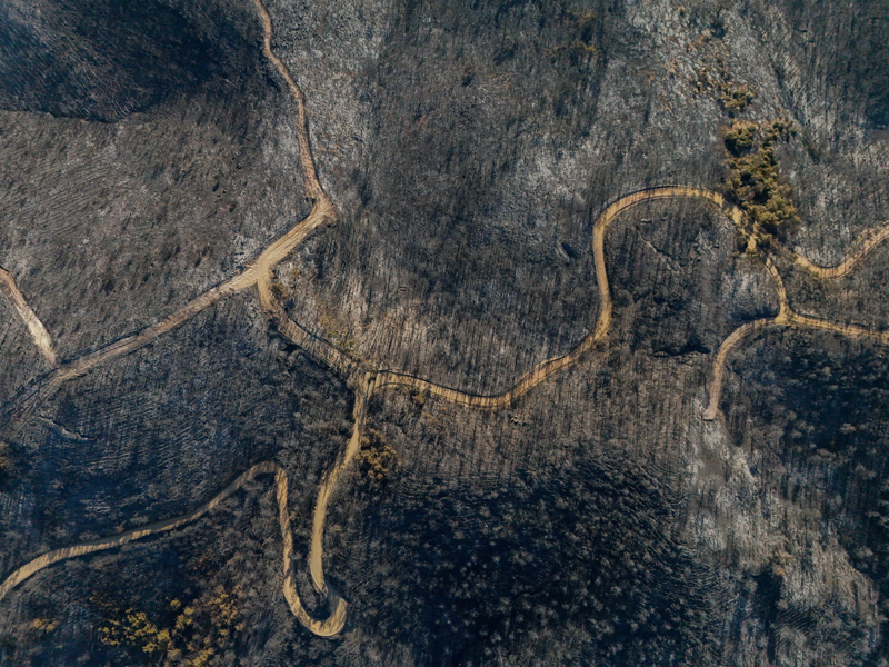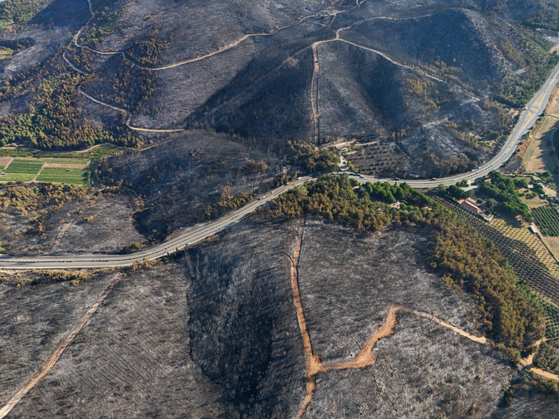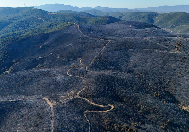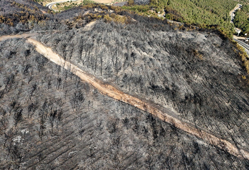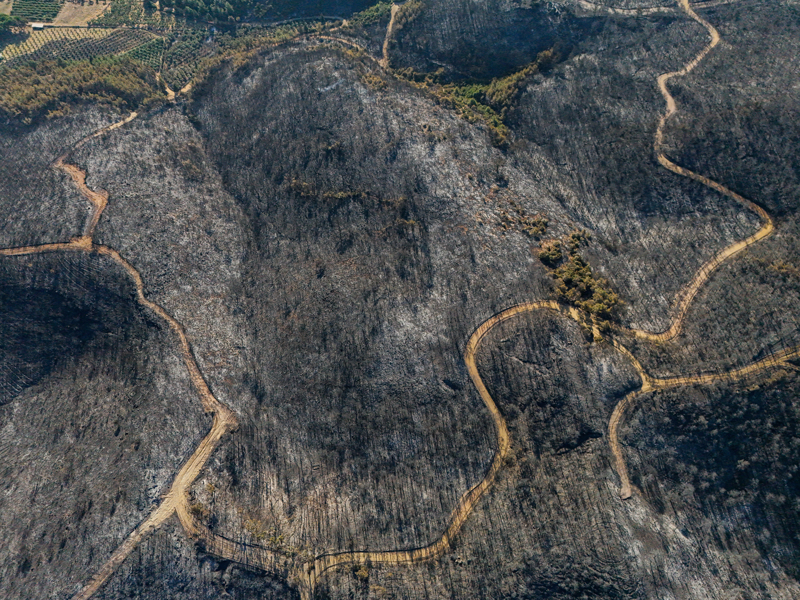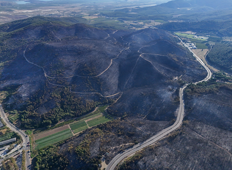 İzmir'in Selçuk ilçesinde çıkan yangında zarar gören ormanlık alan, dron ile havadan görüntülendi.