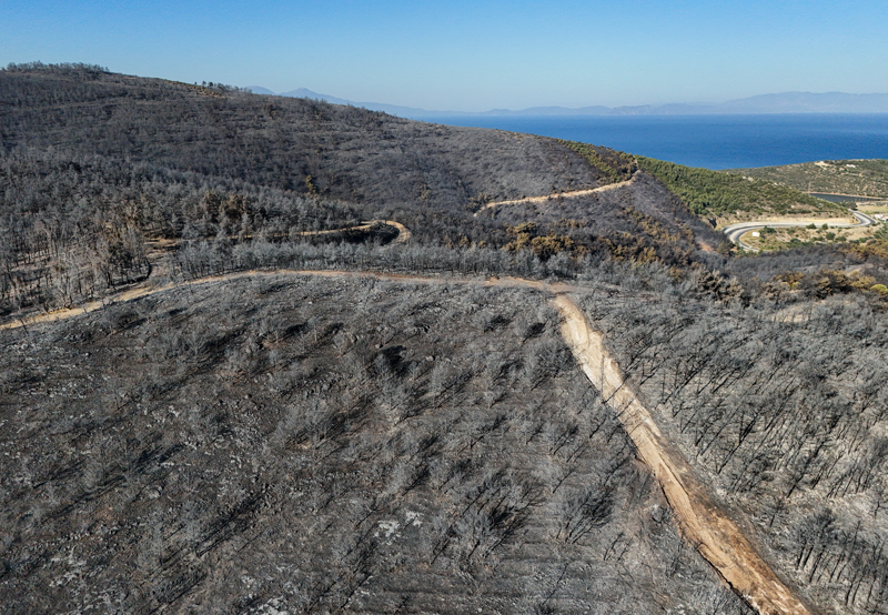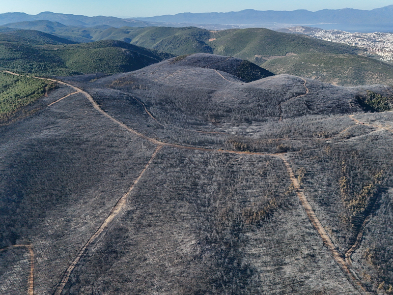 Rüzgarın da etkisiyle büyüyen ve Aydın'ın Kuşadası ilçe sınırlarını aşan yangından etkilenen alanlar, gri ve siyah renge büründü.