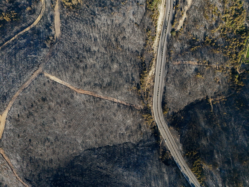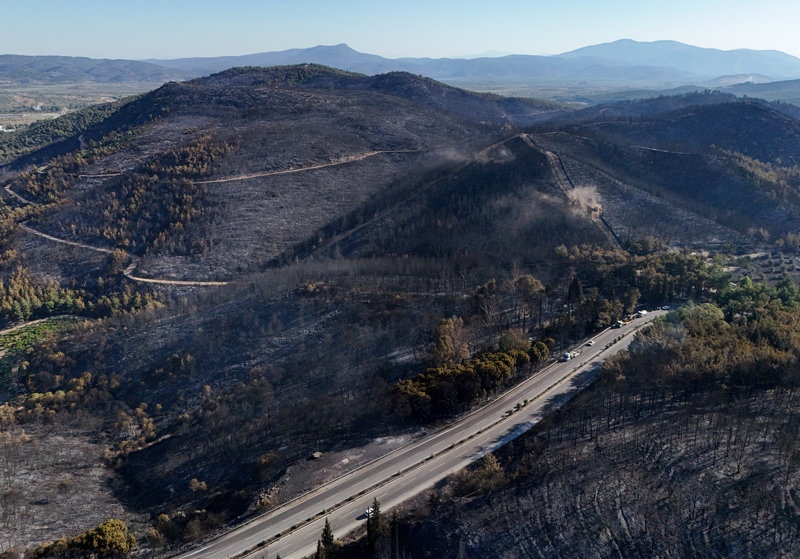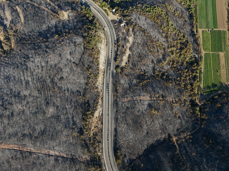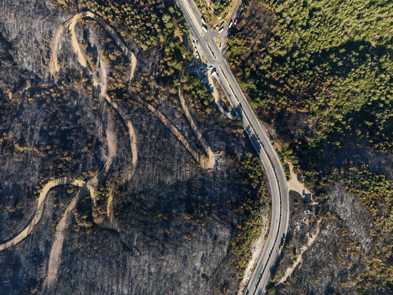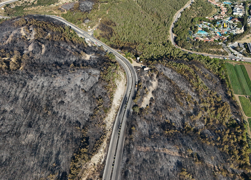 Dron ile çekilen görüntülerde, Selçuk-Kuşadası yolu çevresinde zarar gören ormanlık alan ve ekiplerin devam eden çalışmaları yer aldı.