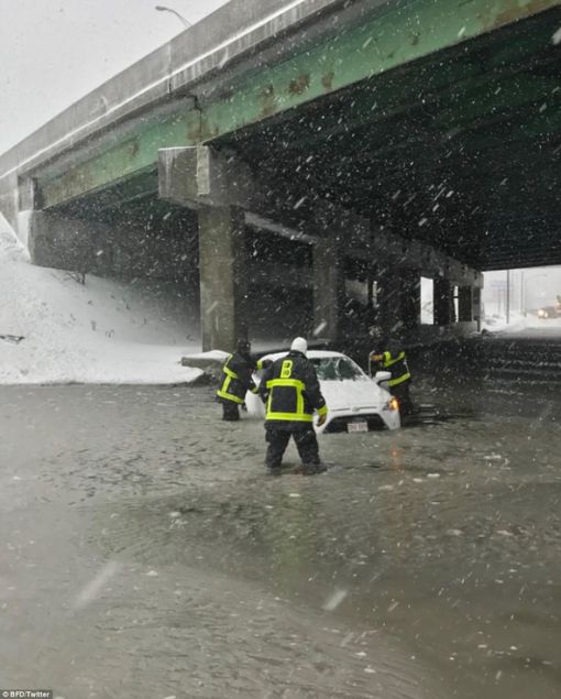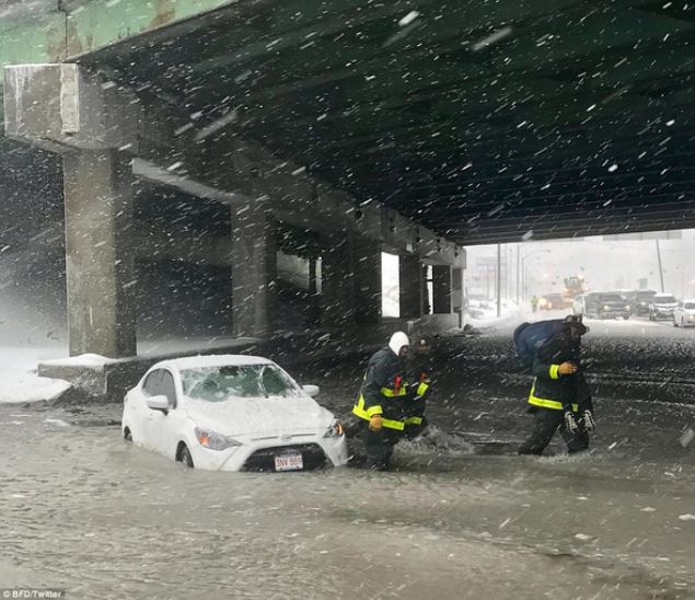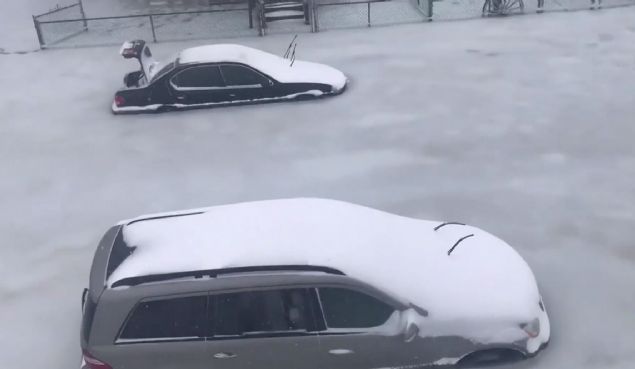 Boston'da görüntülenen bu sokakta donmuş karlar araçları kapladı. Revere bölgesinde kaydedilen görüntüde bölgeyi önce sel bastığı sonra kar yağdığı görülüyor.